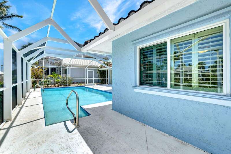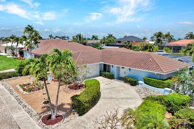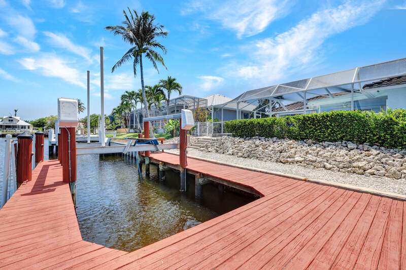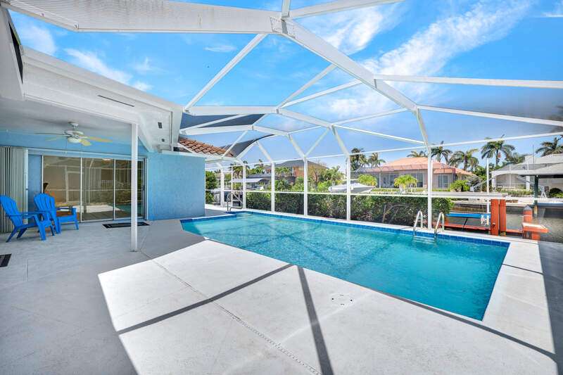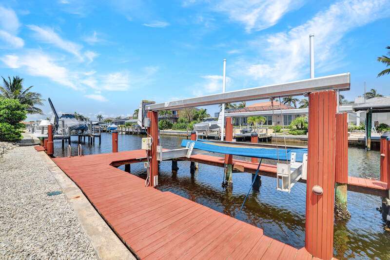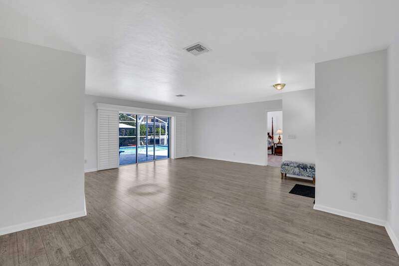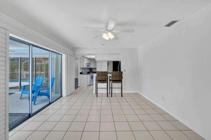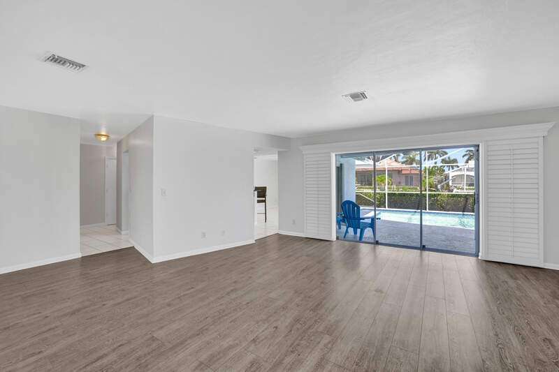Exceptional value on this beautifully maintained waterfront pool home located on a quiet cul-de-sac with desirable southeast exposure for all-day natural light. This 3-bedroom, 2-bath home offers a bright and open layout with plantation shutters, tile plank and carpet flooring, and a welcoming double-door entry. The kitchen features white cabinets, granite countertops, stainless steel appliances, and a pantry. The spacious primary suite includes private outdoor access, while two guest bedrooms share a full bath. Enjoy outdoor living on the screened lanai (2019) overlooking the retiled and resurfaced pool (2017). Additional upgrades include new HVAC (2023), water heater (2023), roof (2017), and garage door (2018). A new seawall is scheduled for 2025 or 2026. The low-maintenance yard is a tropical retreat with a mature avocado tree, plumeria, and hurricane shutters for added protection. This move-in ready home offers comfort, peace of mind, and true Florida living-ideal for full-time or seasonal enjoyment.