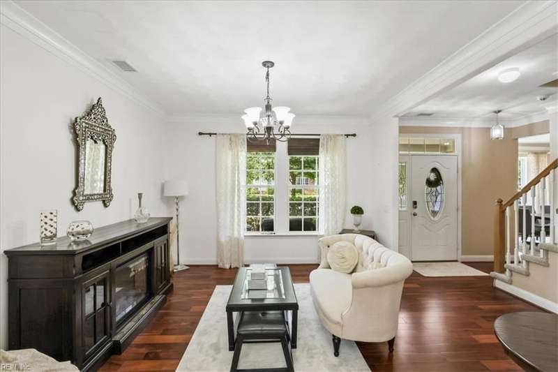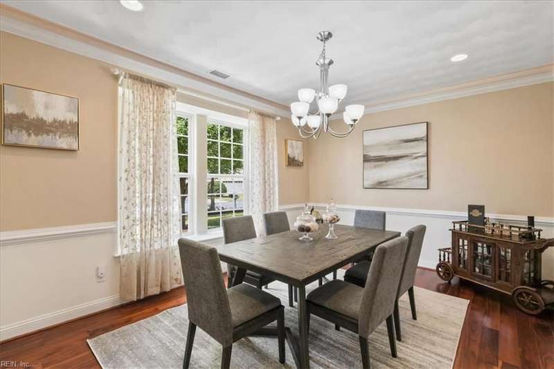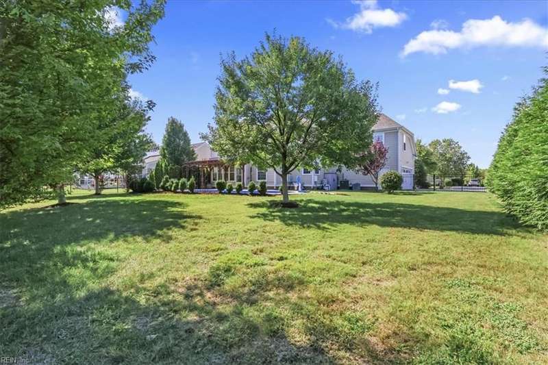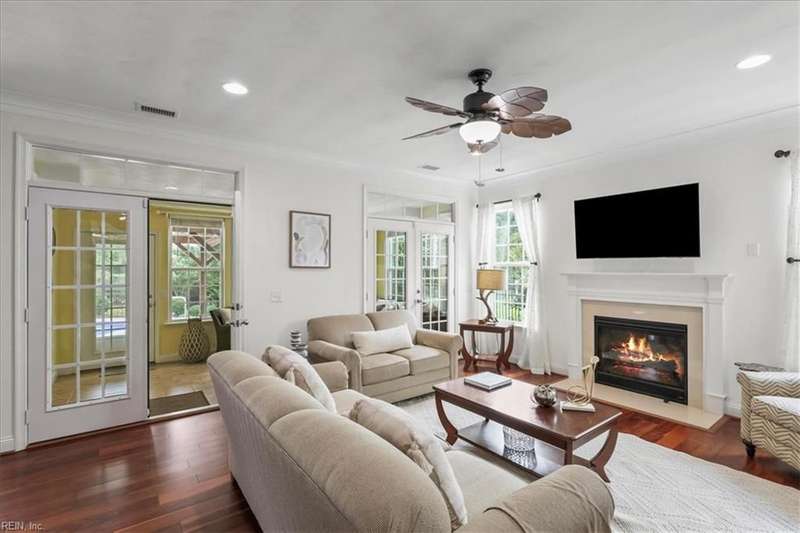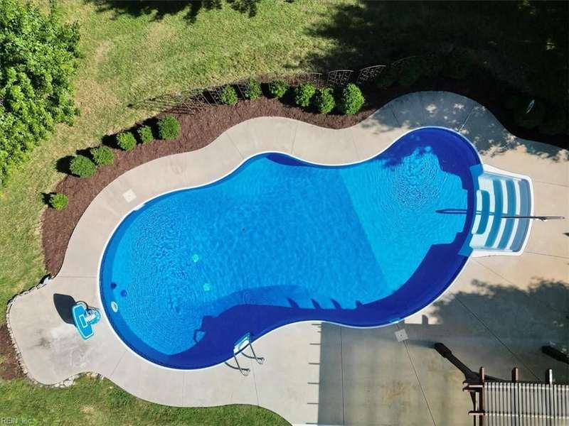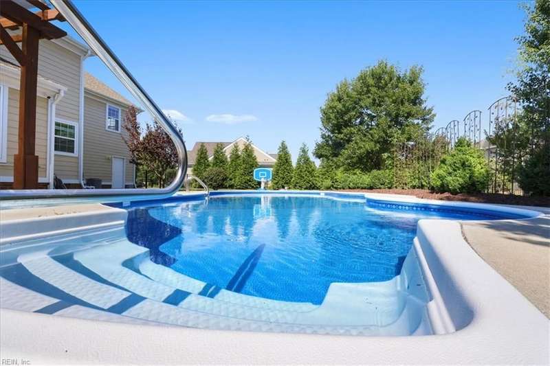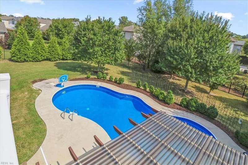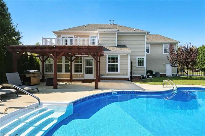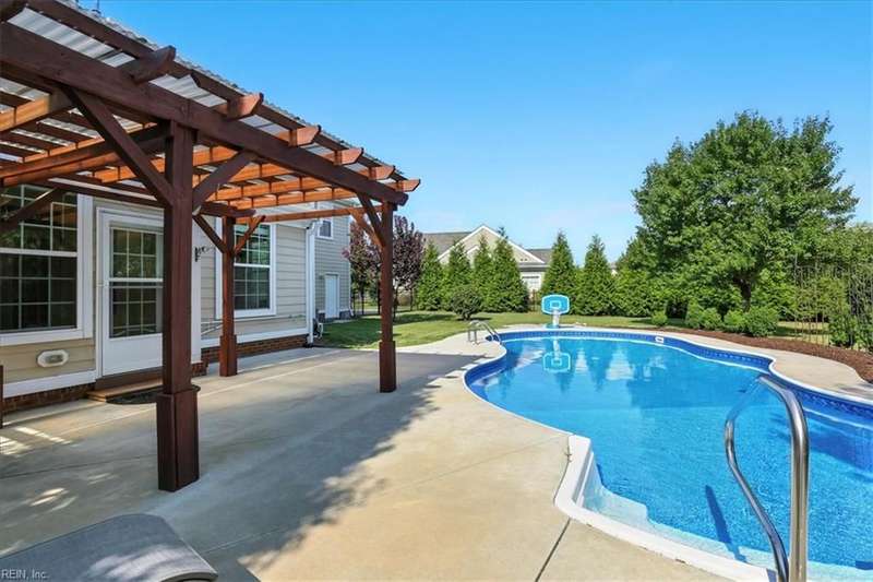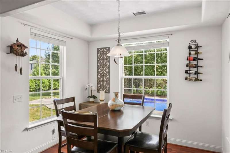 Imagine unwinding by your own sparkling pool at this beautiful North Shore home! A welcoming porch leads inside to an open, light-filled floor plan with versatile spaces perfect for both everyday living and entertaining. The kitchen features granite countertops and a breakfast area with views of the pool, while the sunroom and family room with a cozy gas fireplace invite you to relax and gather.Upstairs, the primary suite feels like a private retreat with elegant mahogany hardwood floors, a private deck overlooking the pool and garden, a sitting area (ideal for office or nursery), a spacious walk-in closet, and a spa-like bath with jetted tub, dual vanities, and separate shower. The finished room over the garage offers even more flexibility, complete with a full bath added in 2021,ideal for guests, a media room, or home gym.