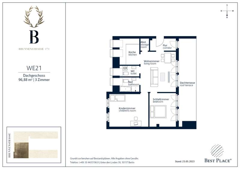 The Wilhelminian style house "Brunnenstraße 171" was built in 1900 and radiates the timeless elegance of the Wilhelminian era with its classic Berlin façade. The ensemble consisting of a front house, side wing and a coach house, this magnificent building offers a total of 20 flats and two commercial units. The flats are partly rented, are accessed via a charming staircase and have 2 to 4 rooms with a living space of 36 to 113 sqm. Balconies and terraces on the courtyard side, including a roof terrace on the upper floor, ensure cosy hours outdoors. The lovingly maintained inner courtyard with bicycle parking spaces not only invites you to relax, but also offers additional respite from the hustle and bustle of everyday life. If you want to invest in the heart of Berlin's Mitte, this is the place for you.