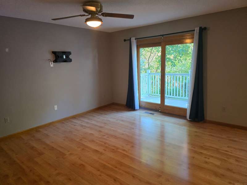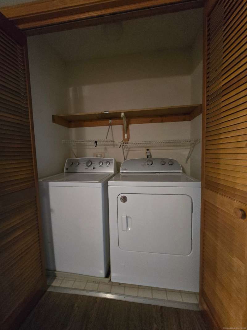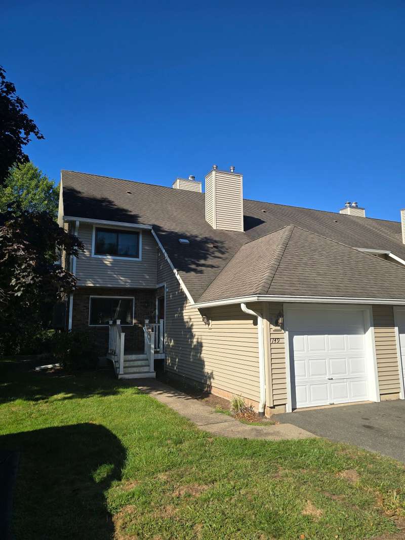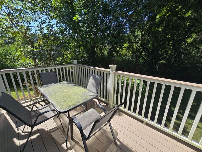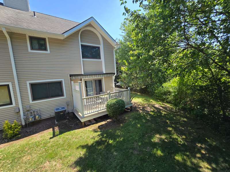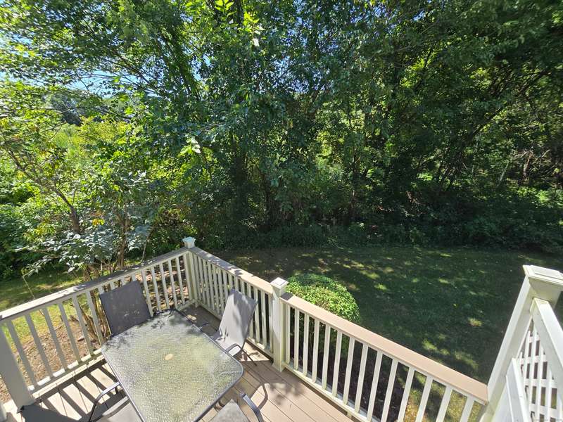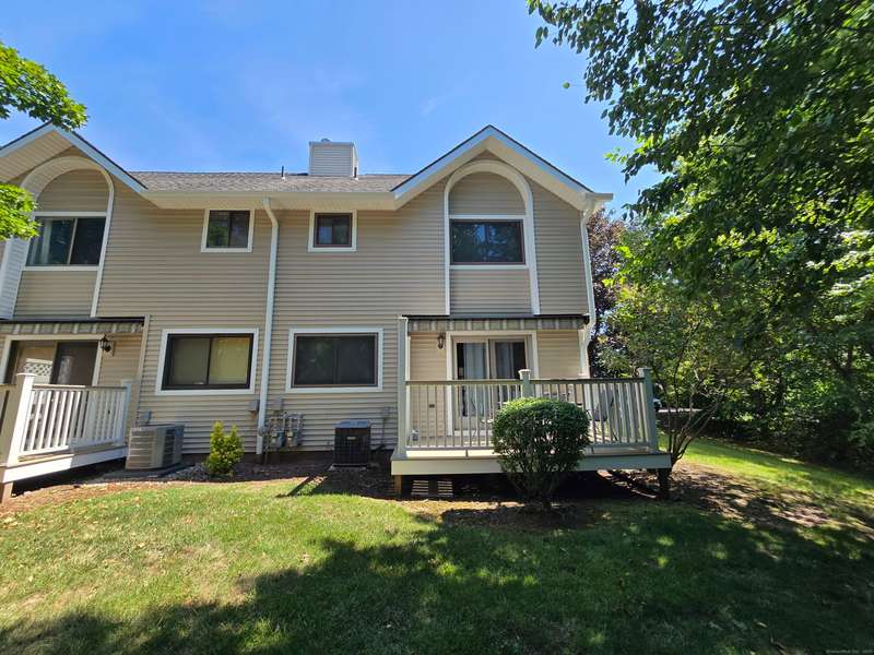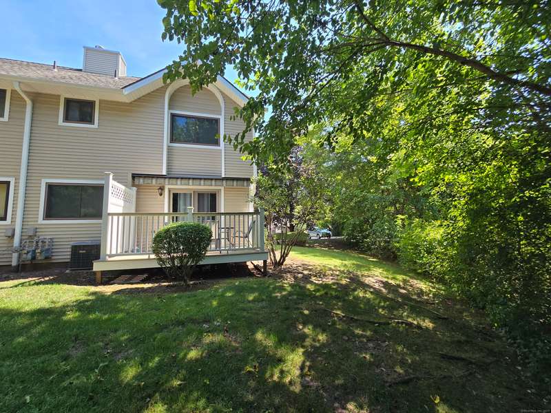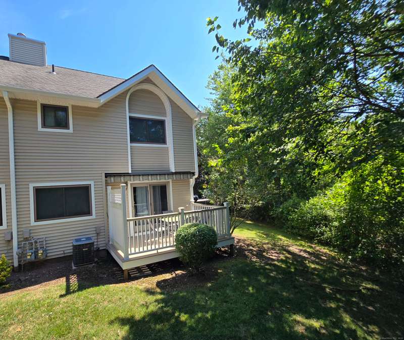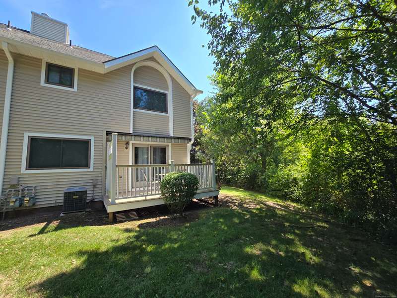 The coveted end unit in Foxboro. Open floor plan with large eat-in kitchen with lots of cabinets, counter space, ceramic tile flooring, and stainless steel appliances. The spacious living room dining room combo has laminate flooring and a slider to the back deck overlooking the woods. Upstairs you will find a large master bedroom with full bath, a ceiling fan, and a walk-in closet. The second bedroom has a generous size closet as well as a ceiling fan and access to the large second bathroom. Finally, you will find your washer and dryer on this floor for the ultimate convenience. The heating and hot water system is high-efficiency and the one car garage offers additional storage. All this and a very short walk to the pool make this a wonderful place to call home. HOA assessment has been paid in full by seller.