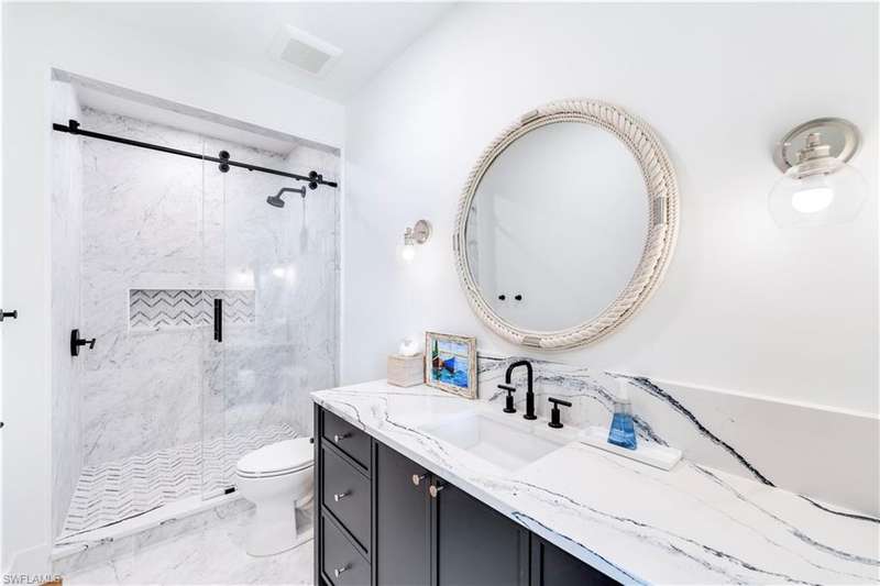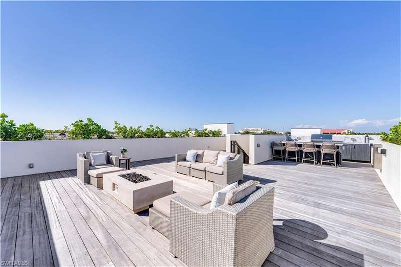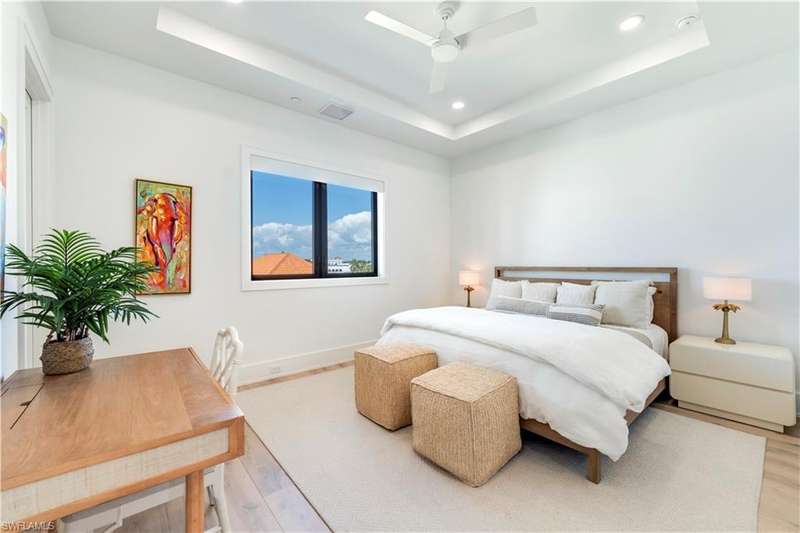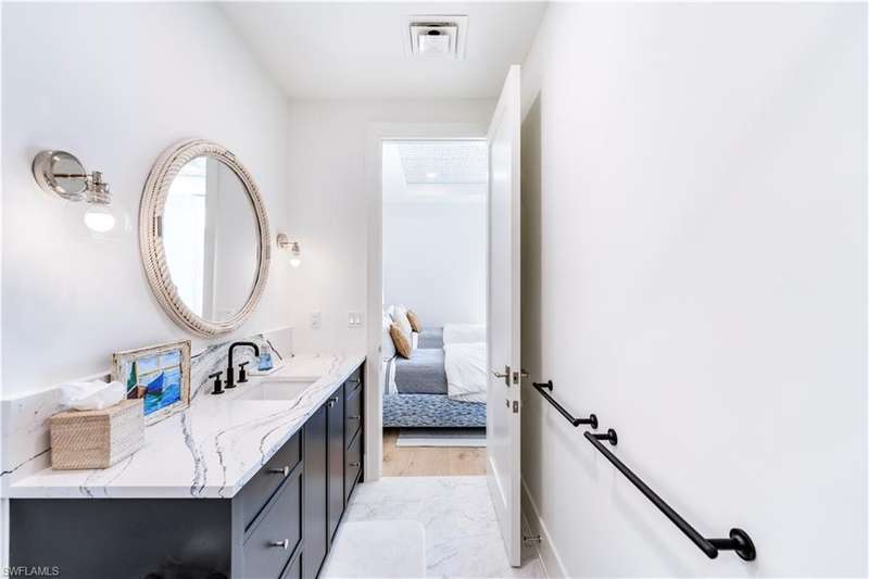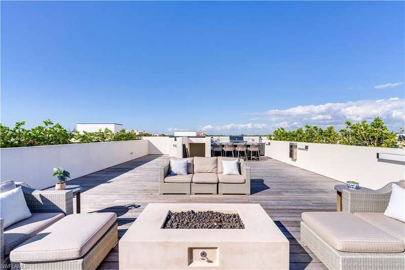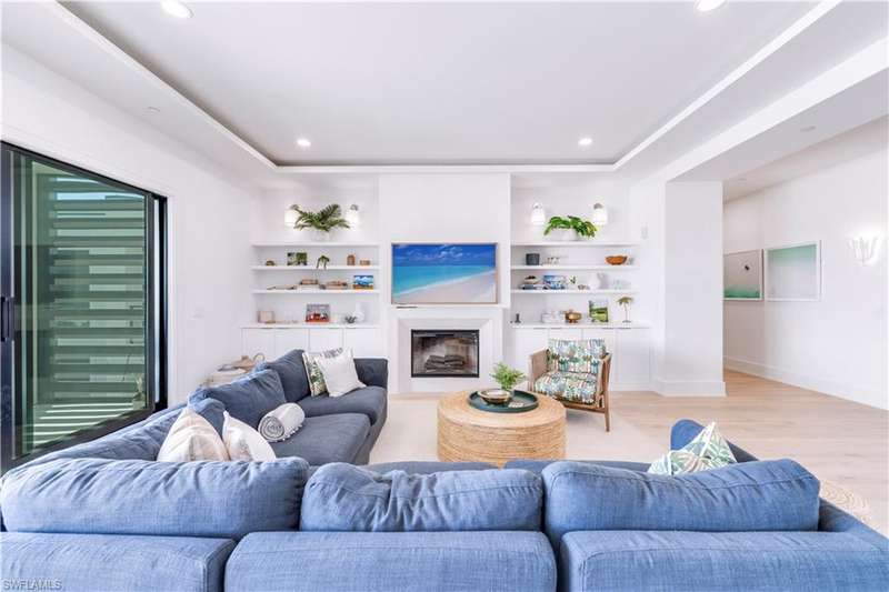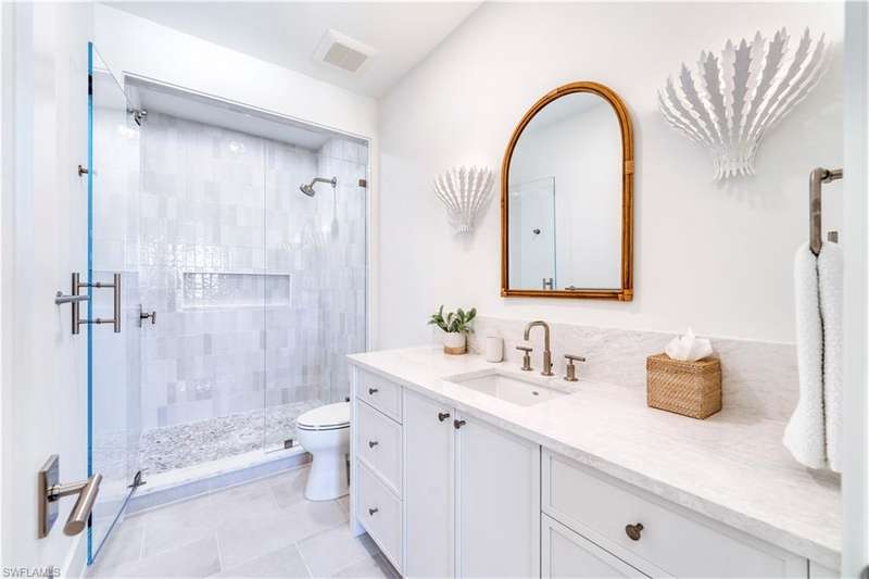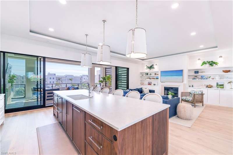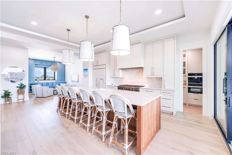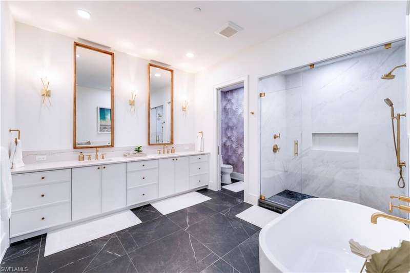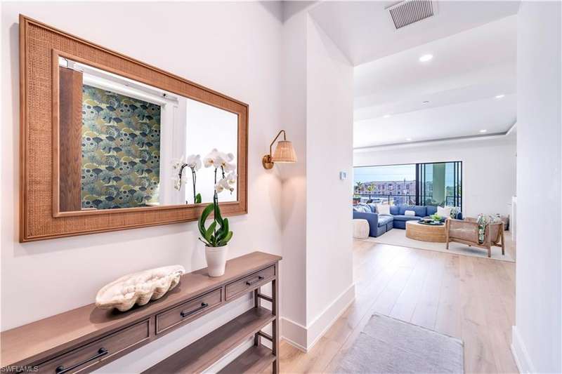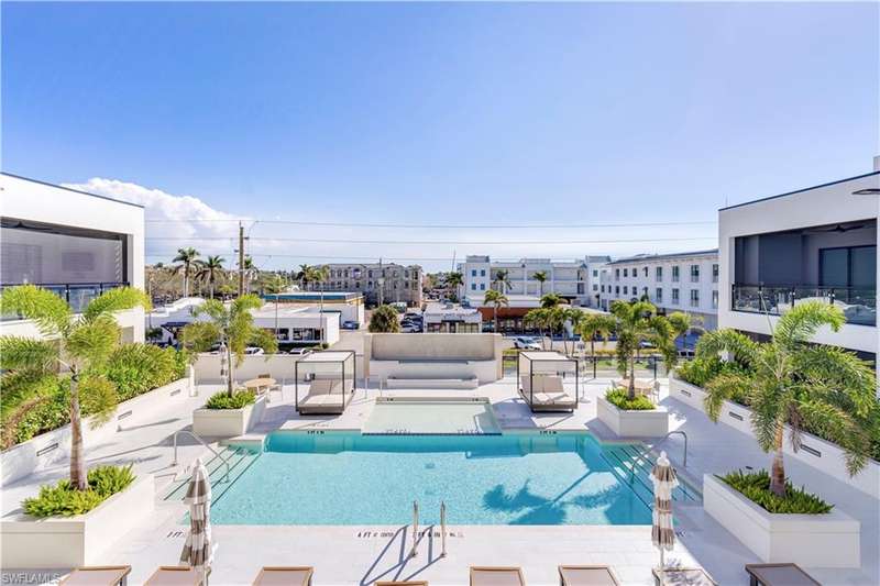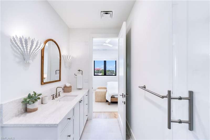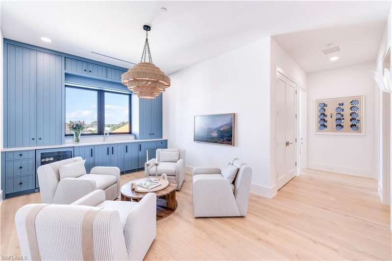 Welcome to Residence 303 a premier penthouse-style residence at Stella Naples, where modern elegance meets coastal sophistication in the heart of Olde Naples. Completed in 2024, this boutique luxury condominium development offers an unmatched living experience just minutes from the upscale dining and shopping of Fifth Avenue South and the sugar-white sands of the Gulf of Mexico. This one-of-a-kind, top-floor residence is a true showcase of architectural distinction and interior design. Styled with whimsical beach house elegance by the award-winning design team at LVD Spaces, this expansive three-bedroom, three-and-a-half-bath home boasts 2,875 square feet of open-concept living space with soaring 10-foot ceilings and a sun-drenched southern exposure. Every detail has been meticulously curated with highly customized designer finishes, from premium wall coverings to elegant lighting and tailored millwork. The gourmet kitchen is a culinary dream, featuring custom Ruffino cabinetry, quar