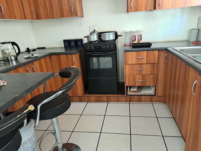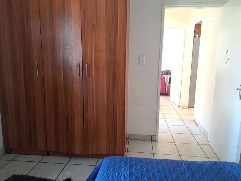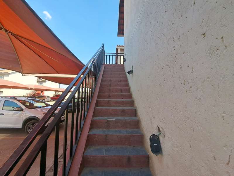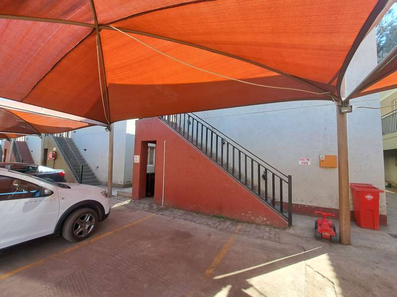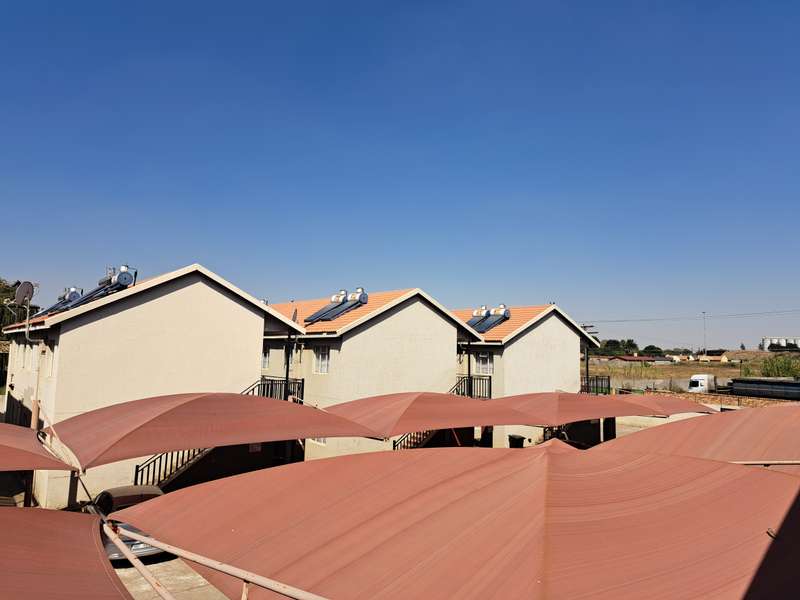 This property is situated in a complex - walled with electric fencing and automatic gate for acess control. 2 bedroom unit on second floor. Rooms with build in cupboards. Bathroom. Open plan kitchen and lounge. Unit tiled. Pre paid electricity. Solar geyser. Carport. Monthly levy of R700. Rates and taxes applicable