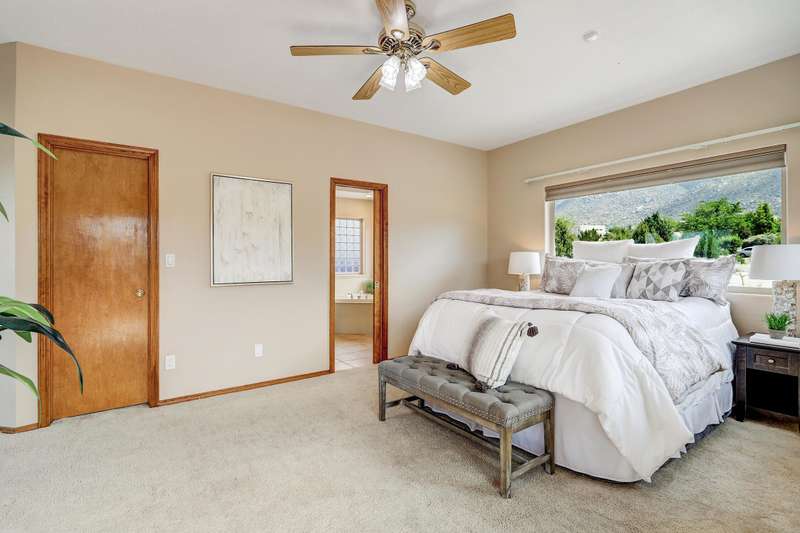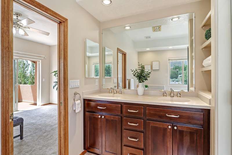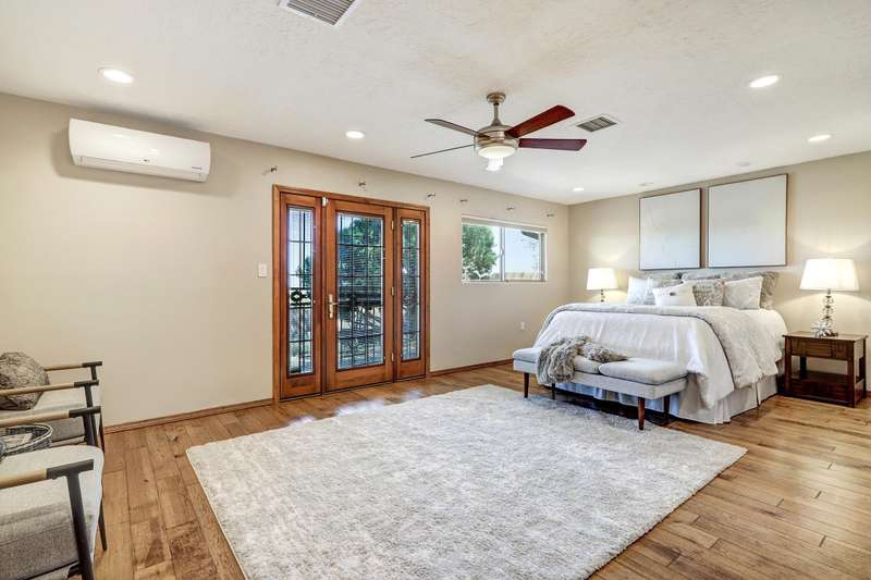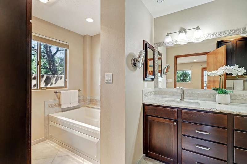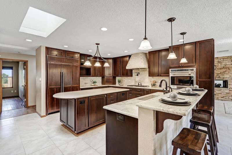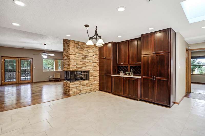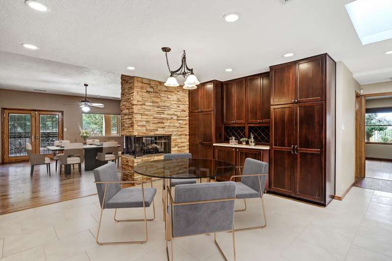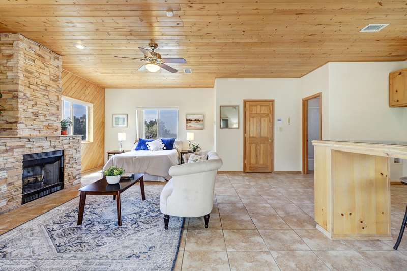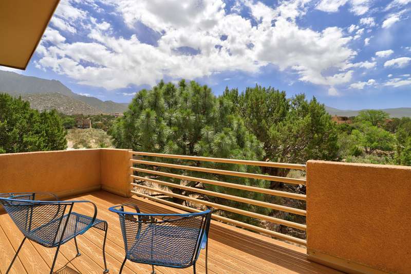 OPEN 6/21/25 1- 3 PM Sandia Heights Stunner! This home sits on just over an acre with mountain and city views. Flexible floor plan provides room for all with TWO large primary suites (one up and one down) each w large closets and remodeled bathrooms, two more generously sized bedrooms with double closets on the main level. Three living spaces offer room to relax or entertain. Huge kitchen with brand new tile and TONS of cabinet and counter space with a massive island, double WOLF ovens WOLF 5 burner cook top and a pot filler, stylish lighting and stone counter tops, & a sub zero fridge. There is room for an eat in kitchen plus space for a larger dining table. Detached casita includes a full bath and a wood burning fireplace. Superb location with highly rated schools