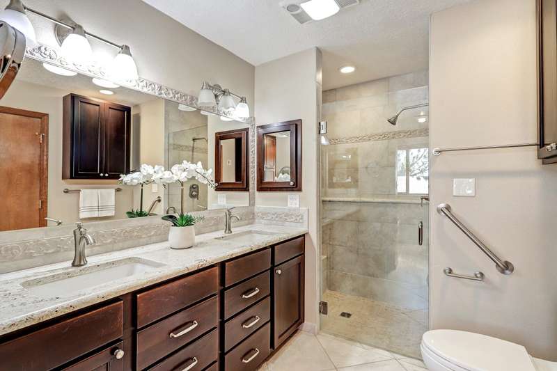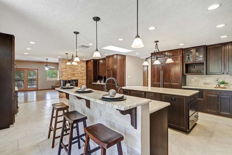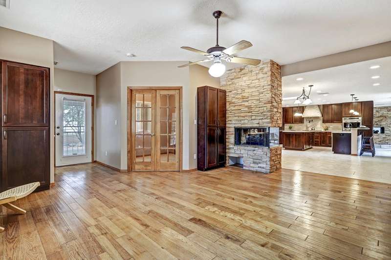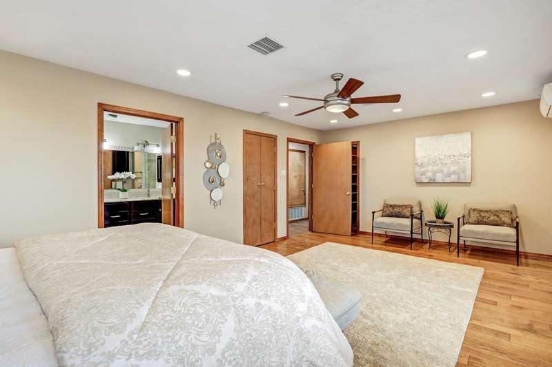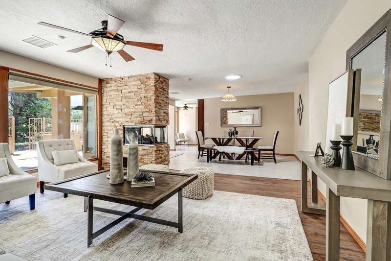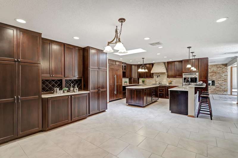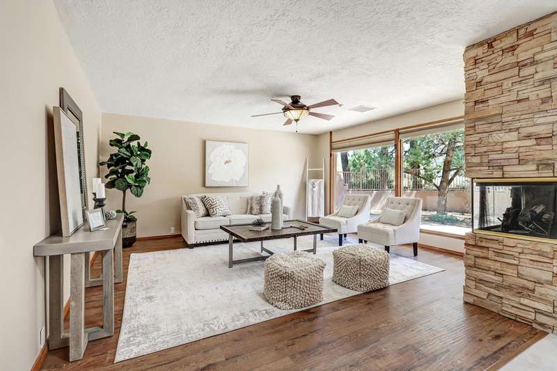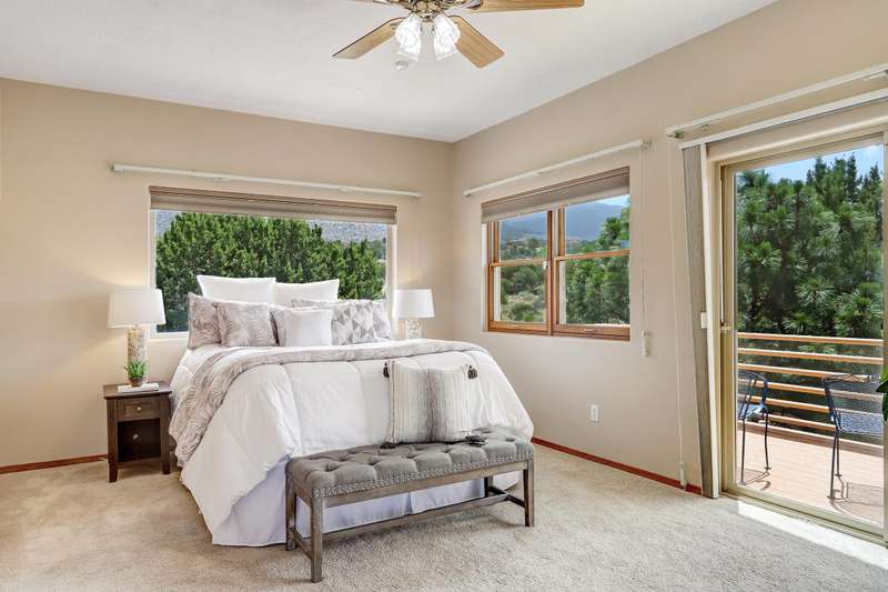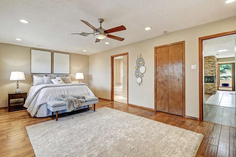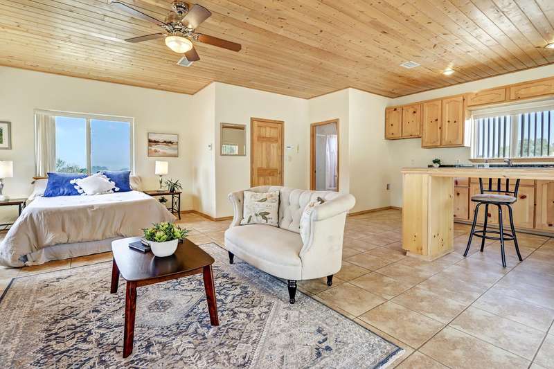 OPEN 6/21/25 1- 3 PM Sandia Heights Stunner! This home sits on just over an acre with mountain and city views. Flexible floor plan provides room for all with TWO large primary suites (one up and one down) each w large closets and remodeled bathrooms, two more generously sized bedrooms with double closets on the main level. Three living spaces offer room to relax or entertain. Huge kitchen with brand new tile and TONS of cabinet and counter space with a massive island, double WOLF ovens WOLF 5 burner cook top and a pot filler, stylish lighting and stone counter tops, & a sub zero fridge. There is room for an eat in kitchen plus space for a larger dining table. Detached casita includes a full bath and a wood burning fireplace. Superb location with highly rated schools