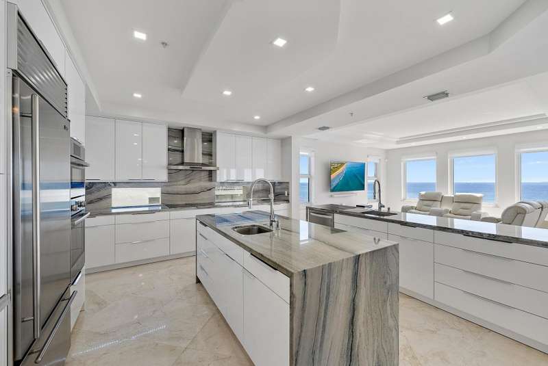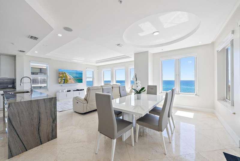 Private Penthouse Oasis with Sweeping Ocean Views. Elevate your lifestyle in this exquisite fourth-floor penthouse at the exclusive Athena, accessible by your own private entry and elevator. This coastal residence offers just under 4,000 square feet of single-level living, showcasing unobstructed, panoramic views of the Atlantic Ocean from every room. Designed with sophistication in mind, the 4-bedroom, 4-bath layout features a spacious split-bedroom floor plan, full-impact windows, and a grand great room. Entertain effortlessly in the formal living area, highlighted by a custom Italian porcelain feature wall and a sleek wet bar. The chefs kitchen is a culinary masterpiece, outfitted with quartzite countertops and top-tier Bosch, Sub-Zero, and Thermador appliances. This rare offering ...