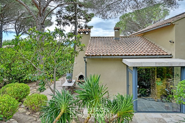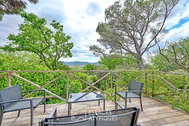 From the very cozy living room, after going down a few steps, you will discover the eat-in kitchen entirely clad in wood and Bahia granite. It invites you to share a meal inside, or outside on the terrace with its breathtaking view. You will enjoy a peaceful wooded garden, where a travertine infinity pool can be seen behind lush vegetation.
