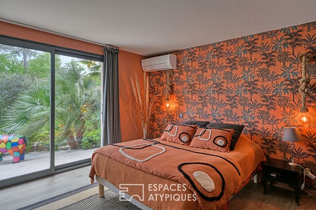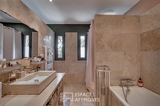 The entrance invites you to push open an old Balinese door that opens onto an elegant living room dressed in very chic blue and black marble and wallpapers in bright and warm colors. But already your gaze escapes beyond the sliding bay window where the green and blue horizon stretches to the Camp de Cesar belvedere. This remarkable landscape can also be contemplated from the teak terrace at any time of day and throughout the seasons for your greatest pleasure.