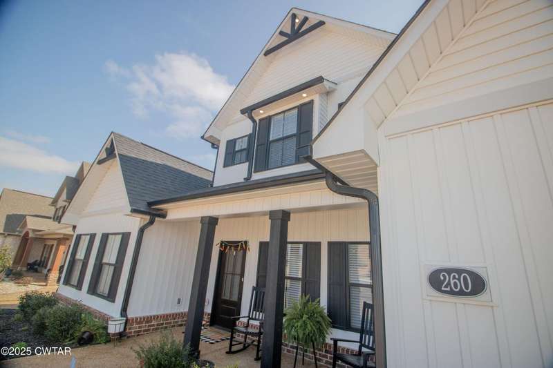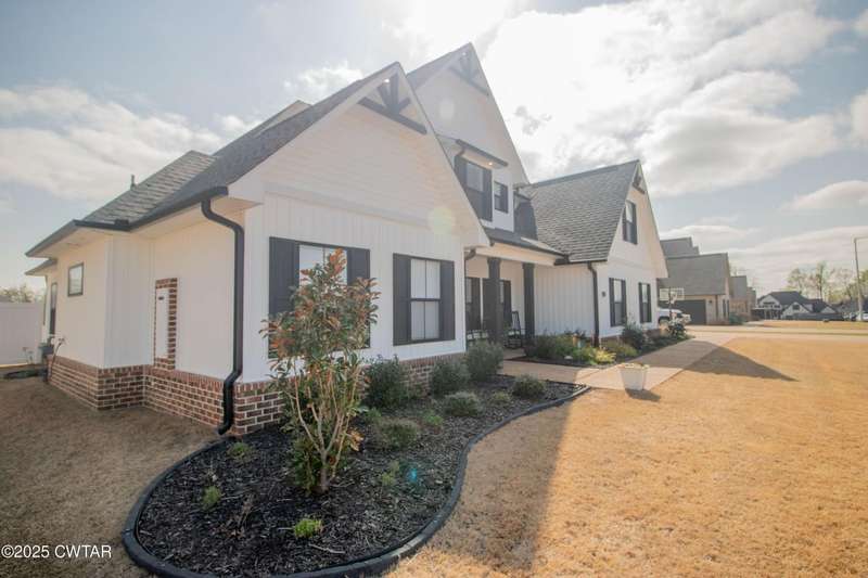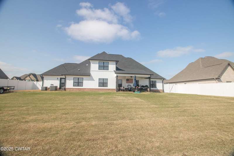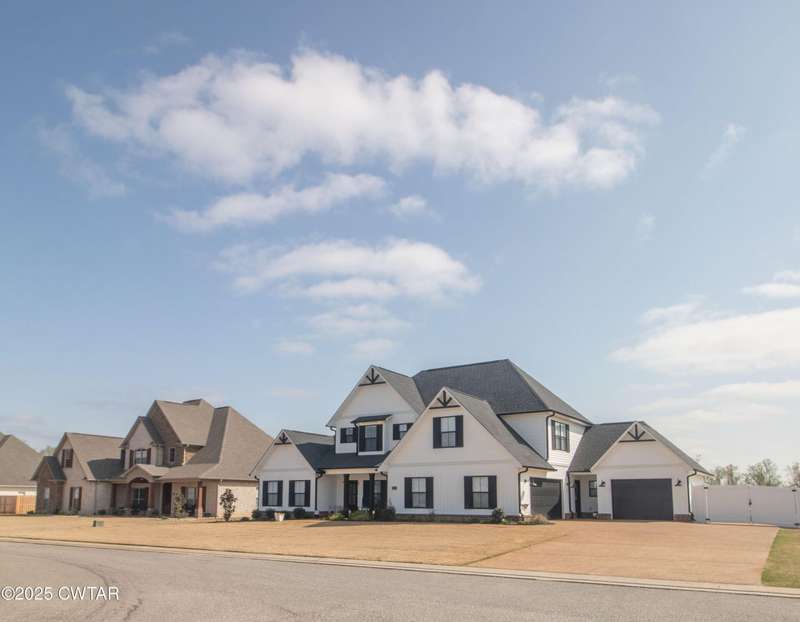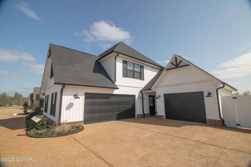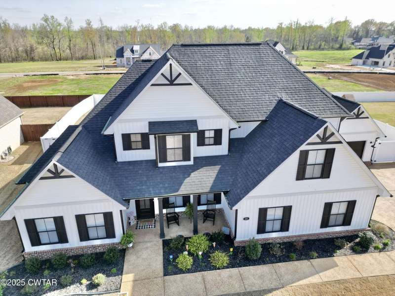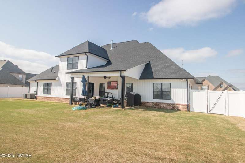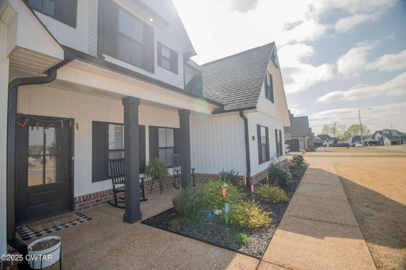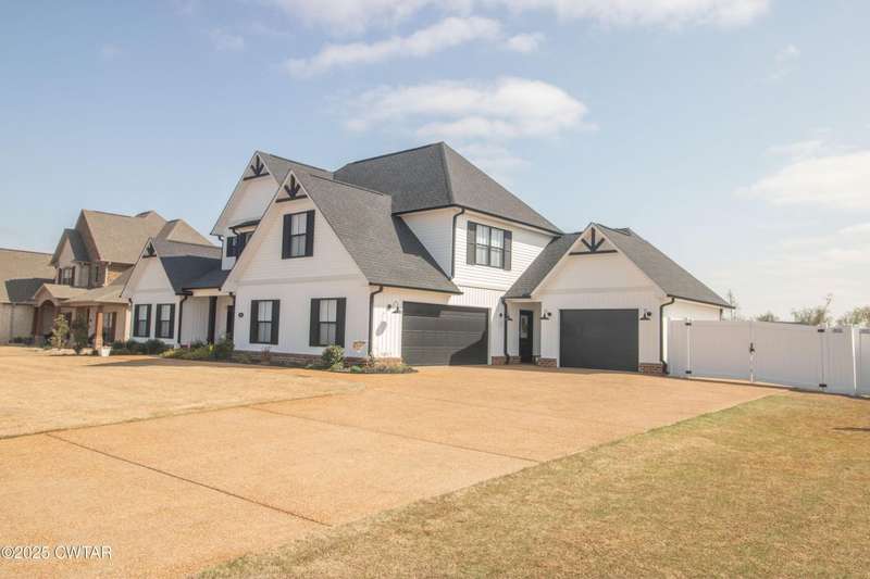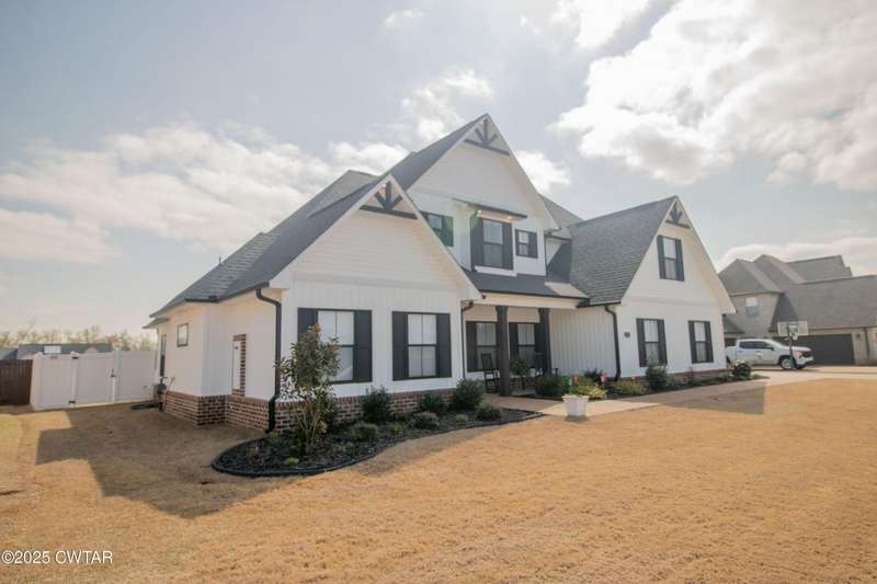 Medina Schools! Providence Subdivision (only 0.6 miles from South Gibson County Middle School). Best curb appeal in the neighborhood. This four-bedroom, two-and-a-half-bathroom home features the following amenities: an office/hearth room, a three-car garage, a covered front porch, a covered back patio, a spacious backyard, exterior lighting in the eaves, double ovens with a gas cooktop, a microwave in an island with a vent hood over the cooktop and double oven, a white cast iron farm sink in the kitchen, a half-brick fireplace, black plumbing fixtures, a frameless shower door/glass in the master tile shower, a soaking tub, double vanity, and a large Master closet. White cabinets throughout with steel gray granite tops, LVP flooring throughout the downstairs and in the upstairs landing and bathroom, hardwood tread stairs, carpet with an upgraded pad in the upstairs bedrooms, and a tankless water heater. Walk-out and pull-down attic space. This floor plan is suitable for a growing family. One family purchased this same floor plan and converted the office into the fifth bedroom. It has custom blinds, a vinyl fence, and a built-in storm shelter. The laundry room is closed from exterior doors. Bar stools, mirrors, and the refrigerator will remain with the property.