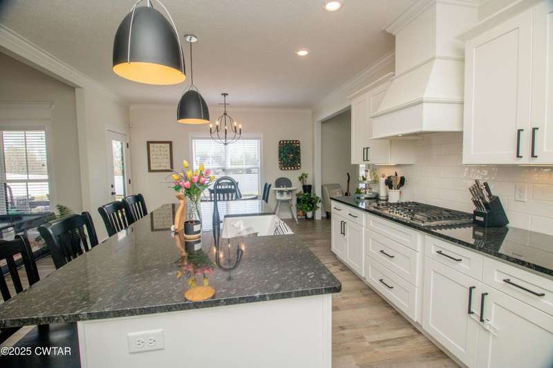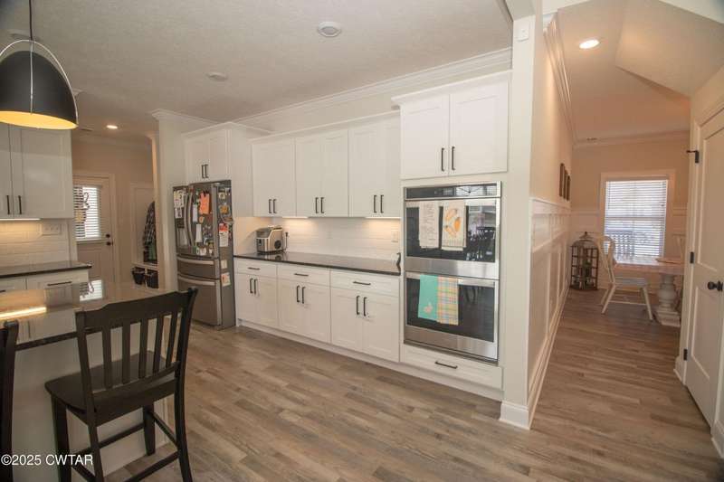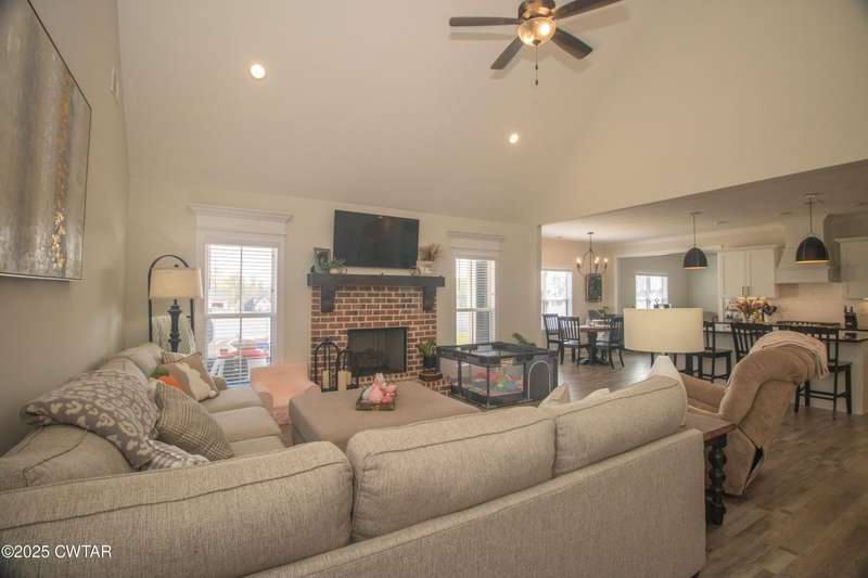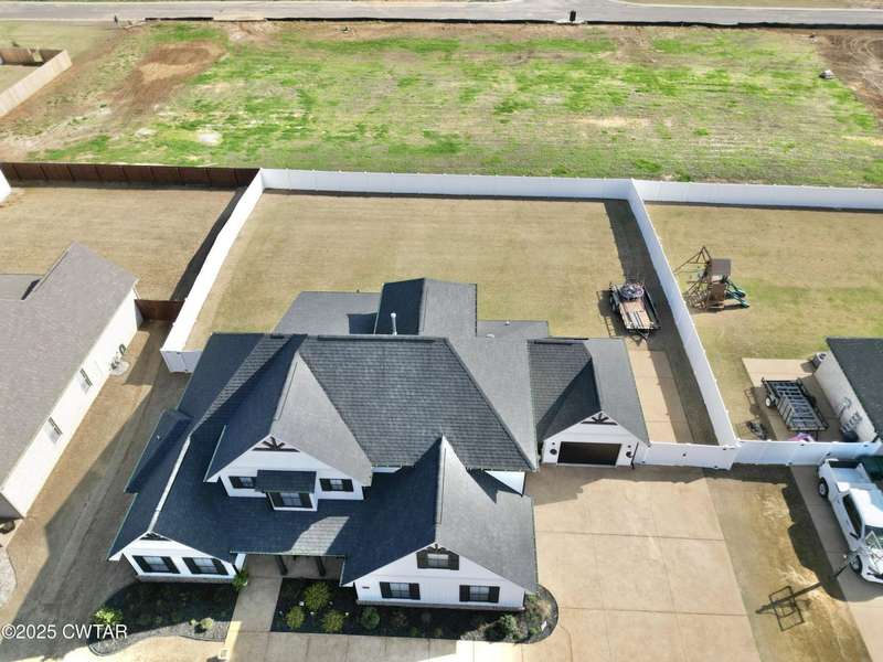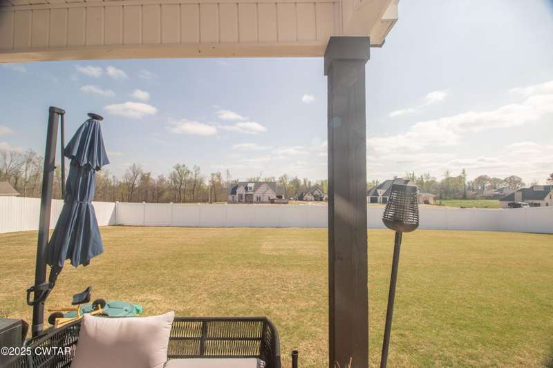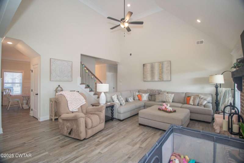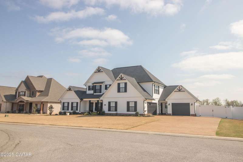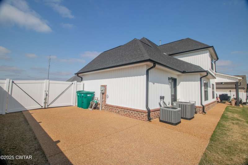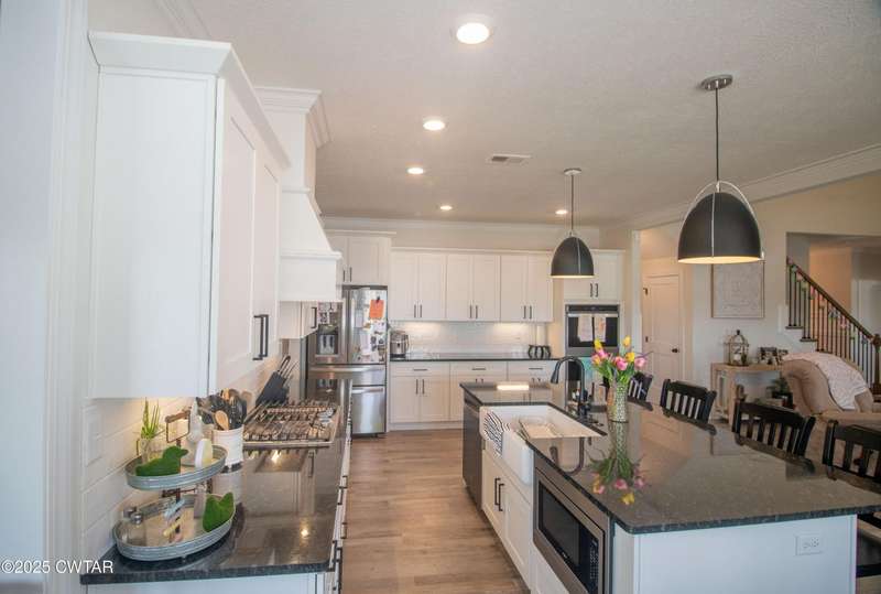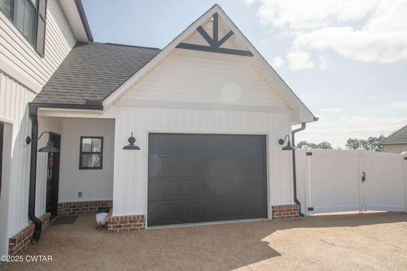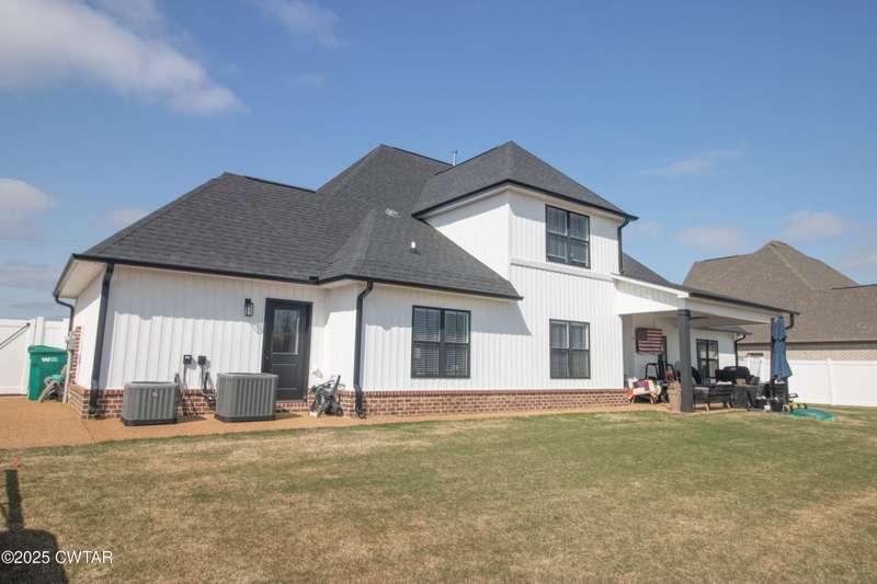 Medina Schools! Providence Subdivision (only 0.6 miles from South Gibson County Middle School). Best curb appeal in the neighborhood. This four-bedroom, two-and-a-half-bathroom home features the following amenities: an office/hearth room, a three-car garage, a covered front porch, a covered back patio, a spacious backyard, exterior lighting in the eaves, double ovens with a gas cooktop, a microwave in an island with a vent hood over the cooktop and double oven, a white cast iron farm sink in the kitchen, a half-brick fireplace, black plumbing fixtures, a frameless shower door/glass in the master tile shower, a soaking tub, double vanity, and a large Master closet. White cabinets throughout with steel gray granite tops, LVP flooring throughout the downstairs and in the upstairs landing and bathroom, hardwood tread stairs, carpet with an upgraded pad in the upstairs bedrooms, and a tankless water heater. Walk-out and pull-down attic space. This floor plan is suitable for a growing family. One family purchased this same floor plan and converted the office into the fifth bedroom. It has custom blinds, a vinyl fence, and a built-in storm shelter. The laundry room is closed from exterior doors. Bar stools, mirrors, and the refrigerator will remain with the property.