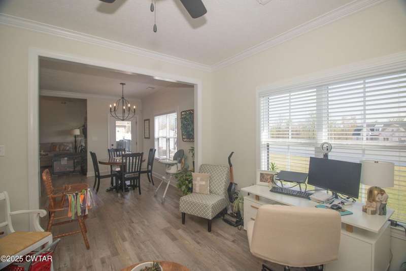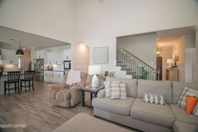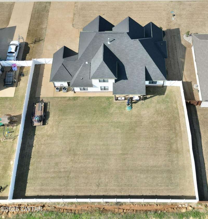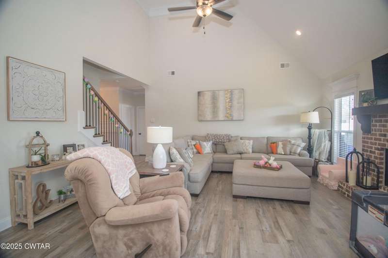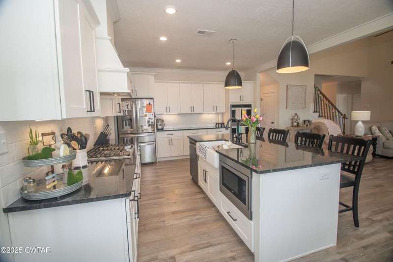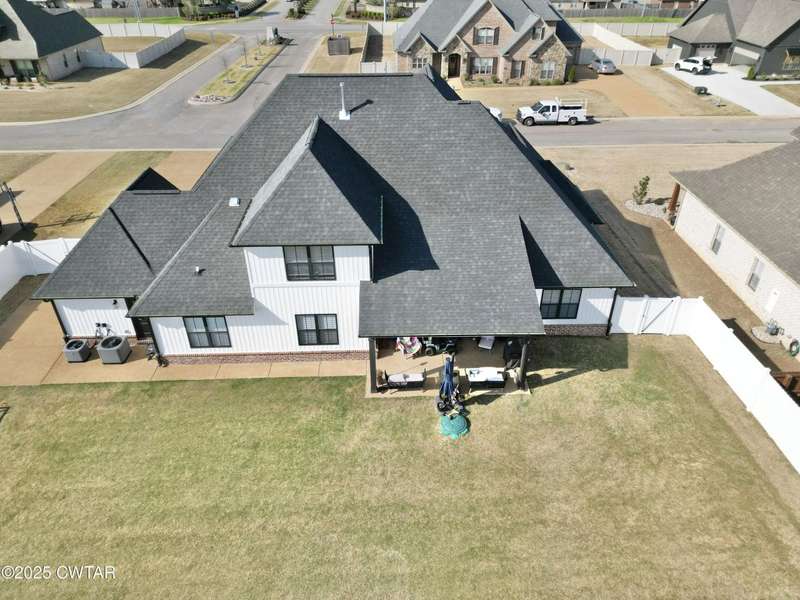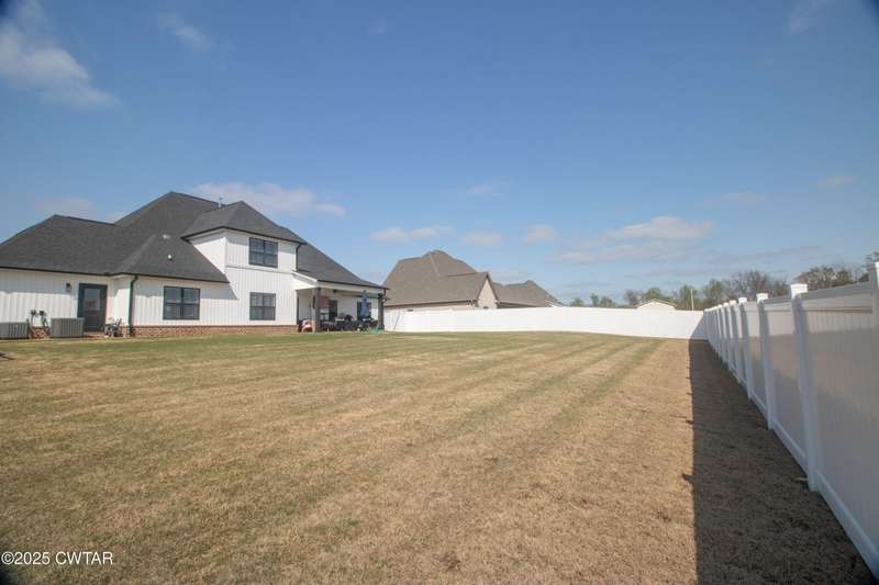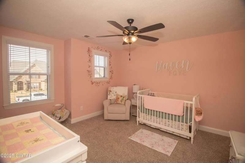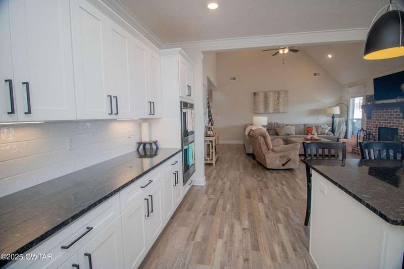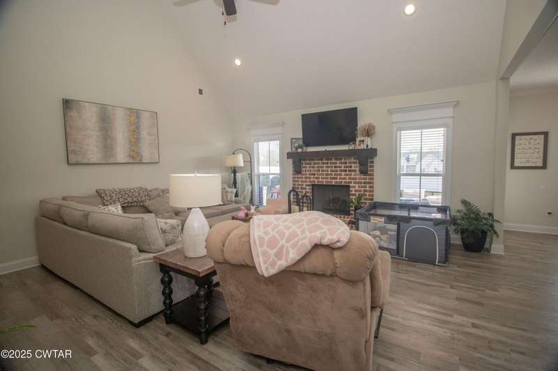 Medina Schools! Providence Subdivision (only 0.6 miles from South Gibson County Middle School). Best curb appeal in the neighborhood. This four-bedroom, two-and-a-half-bathroom home features the following amenities: an office/hearth room, a three-car garage, a covered front porch, a covered back patio, a spacious backyard, exterior lighting in the eaves, double ovens with a gas cooktop, a microwave in an island with a vent hood over the cooktop and double oven, a white cast iron farm sink in the kitchen, a half-brick fireplace, black plumbing fixtures, a frameless shower door/glass in the master tile shower, a soaking tub, double vanity, and a large Master closet. White cabinets throughout with steel gray granite tops, LVP flooring throughout the downstairs and in the upstairs landing and bathroom, hardwood tread stairs, carpet with an upgraded pad in the upstairs bedrooms, and a tankless water heater. Walk-out and pull-down attic space. This floor plan is suitable for a growing family. One family purchased this same floor plan and converted the office into the fifth bedroom. It has custom blinds, a vinyl fence, and a built-in storm shelter. The laundry room is closed from exterior doors. Bar stools, mirrors, and the refrigerator will remain with the property.