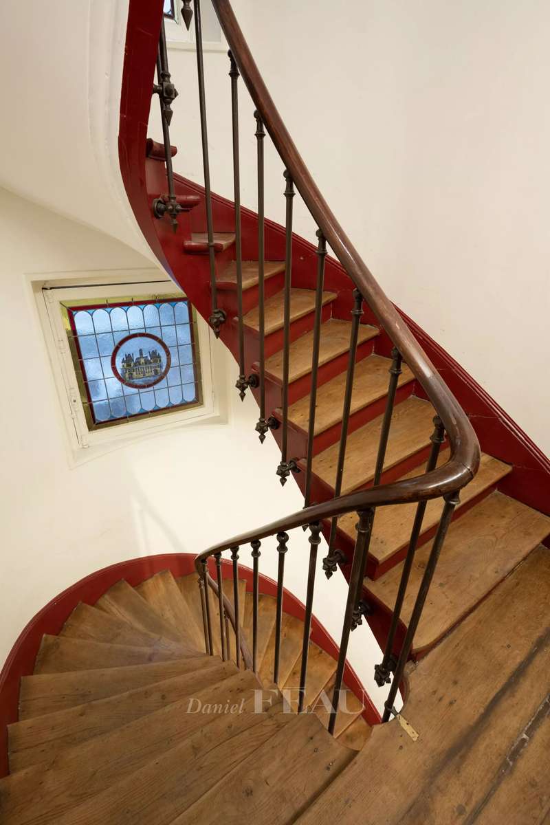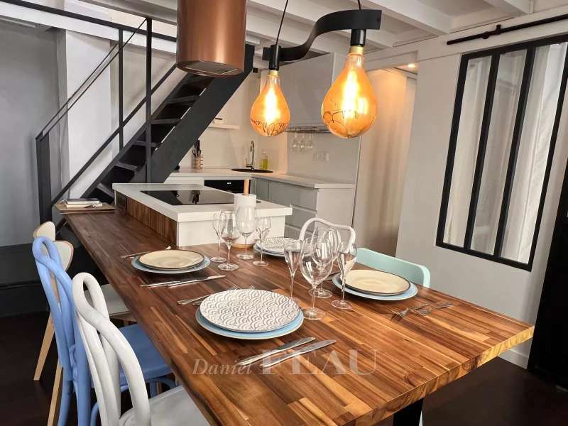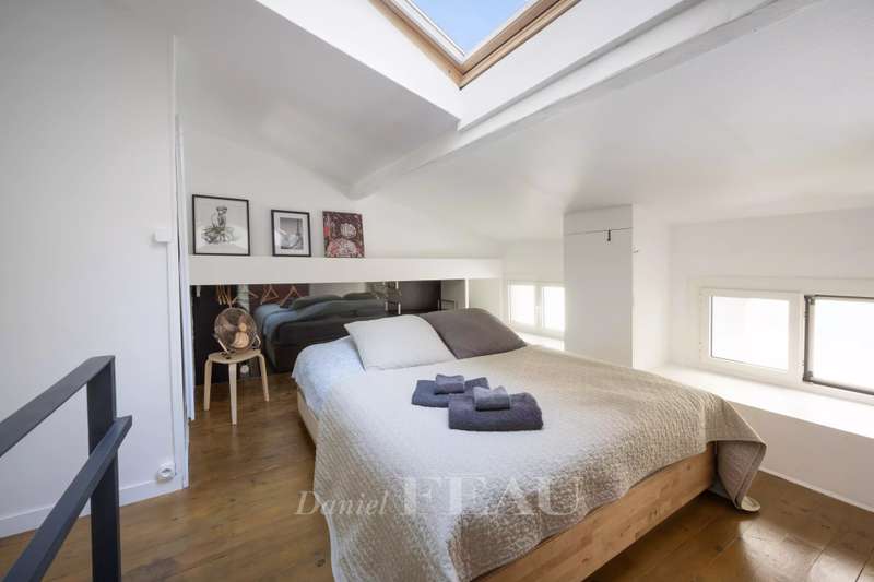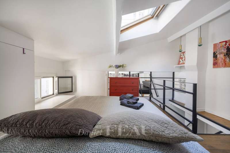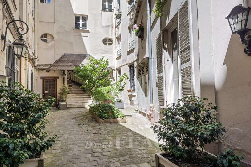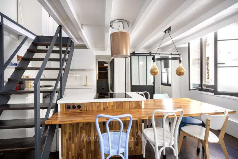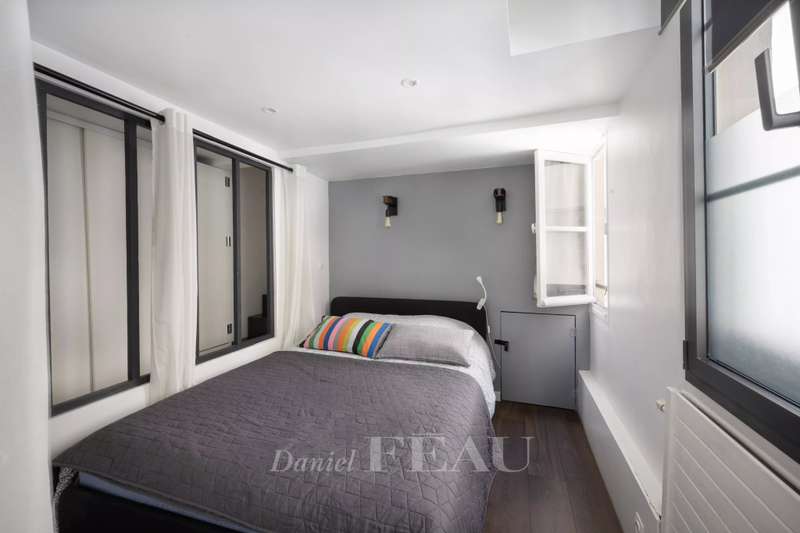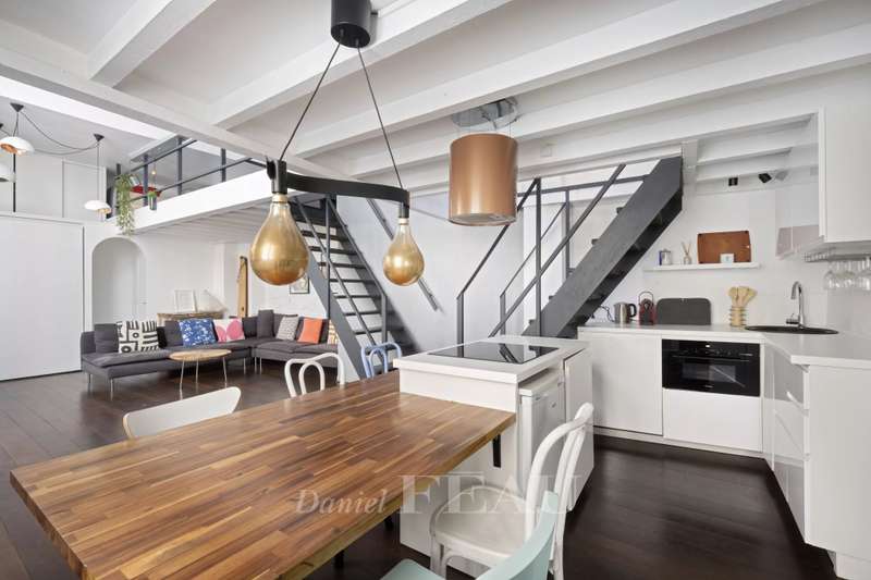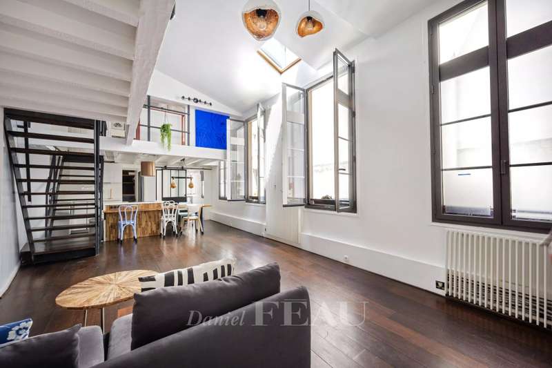 Rue des Archives. This bright and peaceful apartment offering 92 sqm of floor space and 70 sqm of living space as defined by the Carrez Law is on the 2nd and top floor of a fine late 19th century building. It includes a near 45 sqm living/reception room featuring high ceilings, a semi open-plan fitted and equipped kitchen, a bedroom, a shower room and a separate wc. Ample fitted storage space. The upper floor comprises a bedroom with fitted cupboards, and a study area. With a basement cellar.