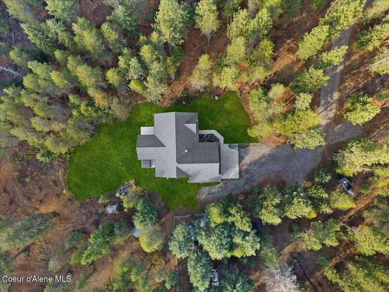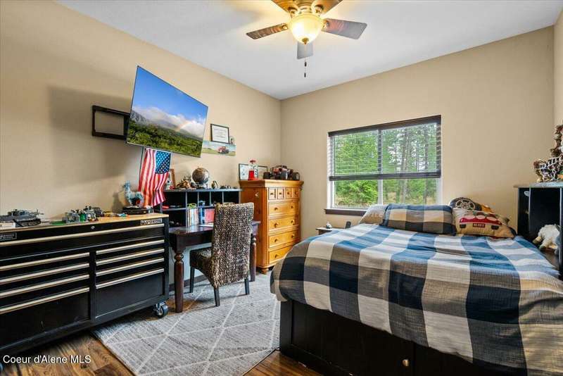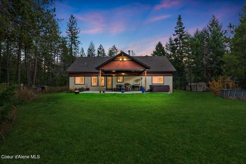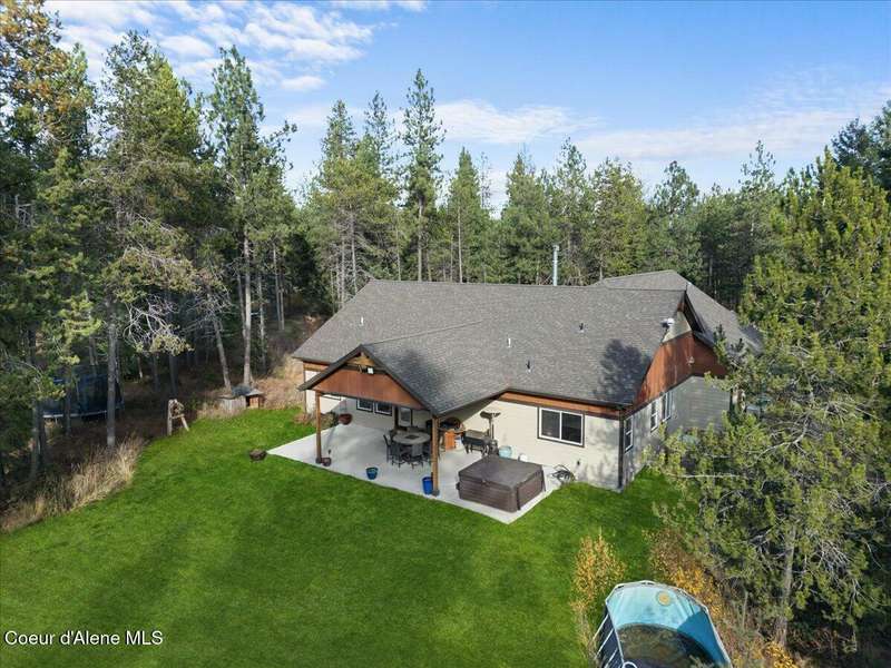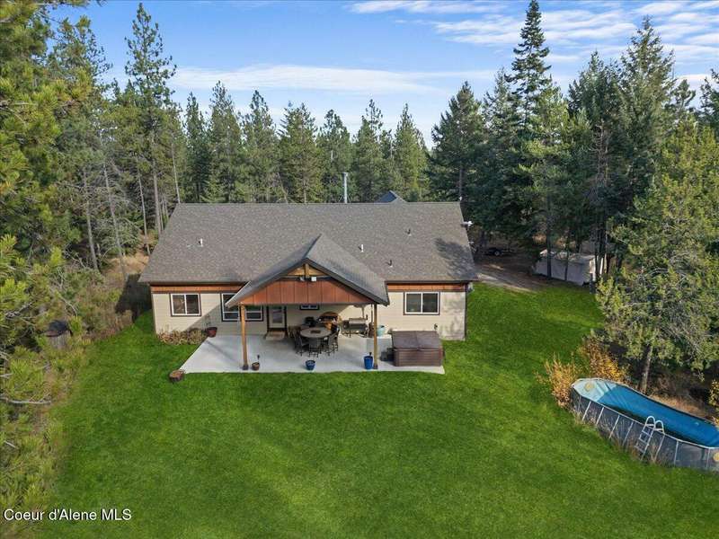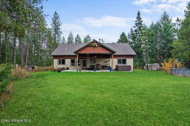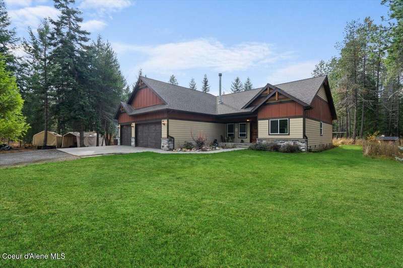 Nestled on 9.95 picturesque wooded acres in Rathdrum, this 2,702 sq. ft. custom built home offers 5 bedrooms, 3 bathrooms, a 3-car garage, and room for your dream shop. Designed for comfort and style, the home features vaulted ceilings, a wood fireplace with rock accents, open gourmet kitchen with solid granite countertops and a walk-in pantry, and a luxurious master suite with a walk-in closet, tiled shower, and jetted tub. Outside, enjoy a gun range, covered patio, firepit, garden, and chicken coup, all while surrounded by incredible wildlife. Located just minutes north of Hayden in the Lakeland School District, this property with its serene country living offers plenty of space to store your toys, entertain or relax all while enjoying the peace and privacy.