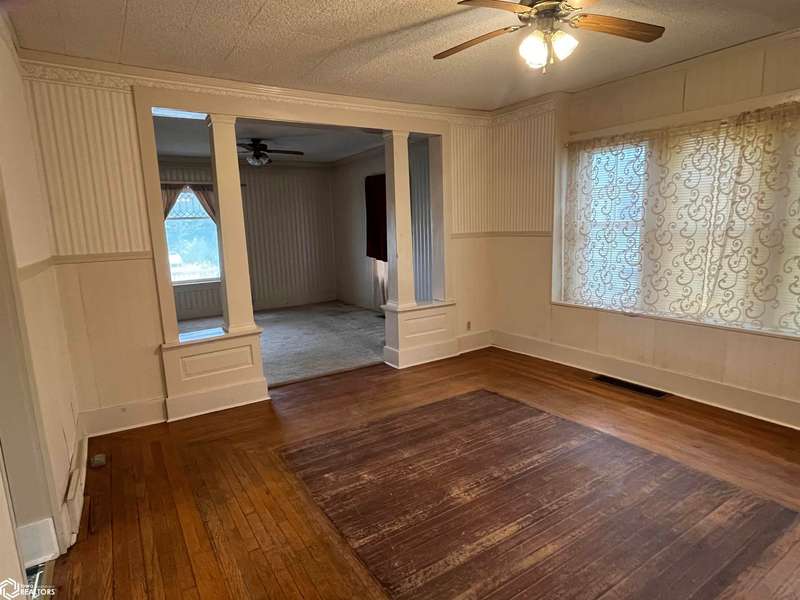 The large kitchen is furnished with stove/oven & refrigerator and many cabinets. The upper level offers 3 good sized bedrooms, full bath and a bonus sun room with many potential uses. The home has been updated with breakers, modern Rudd Furnace and Central Air. There is a concrete pad for parking in the back with alley access. It is a large open back yard. Access to the single car garage is off of 3rd Avenue. It does need new carpeting in the living room and open staircase. There is hardwood flooring thru out the house with linoleum in the kitchen