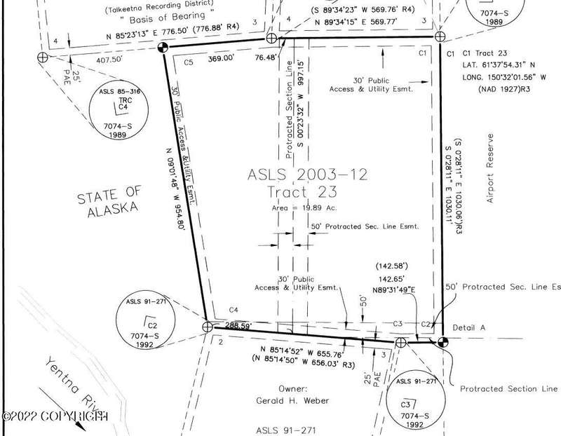 See pages 1 and 5 of the survey attached shows the location of property in relation to Yetna River. Parcel borders ADL 212795. AIRPORT RUNWAY, RIGHT-OF-WAY RUNNING 5500 FEET IN LENGTH AND EXTENDING A WIDTH OF 500 FEET LOCATED WITHIN TRACT A YENTNA REMOTE RECREATIONAL CABIN SITES. 19.89 acres
