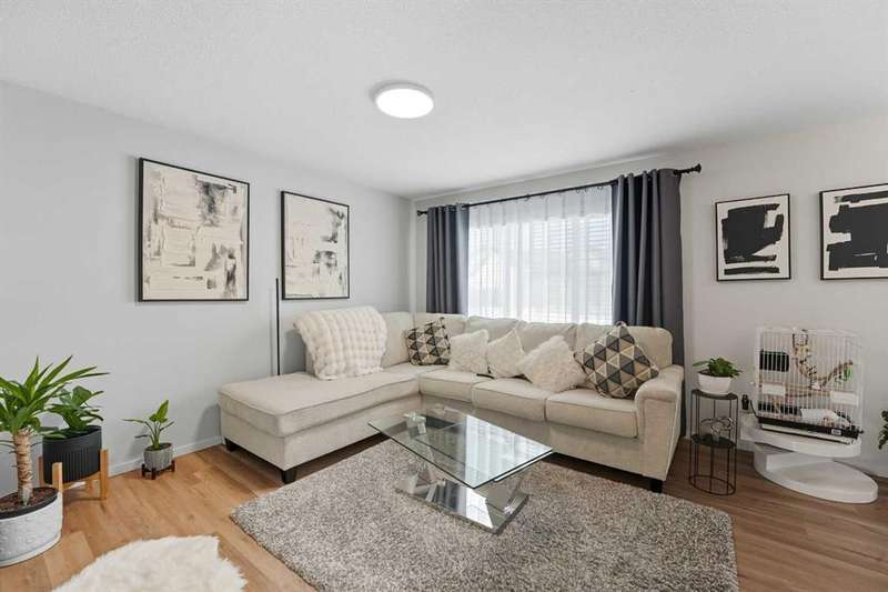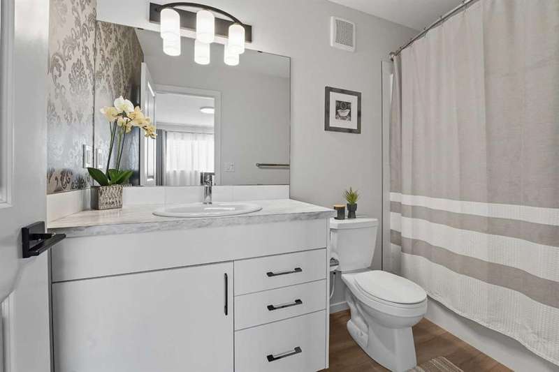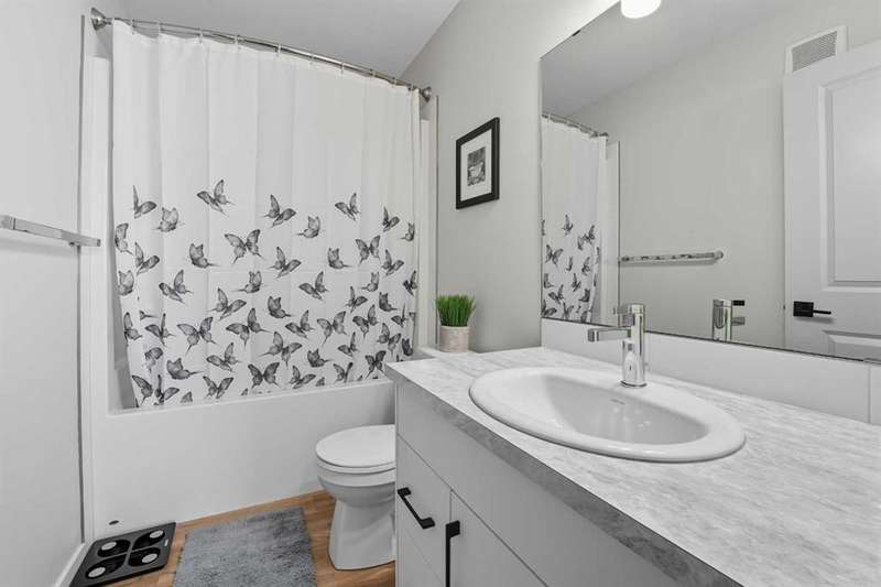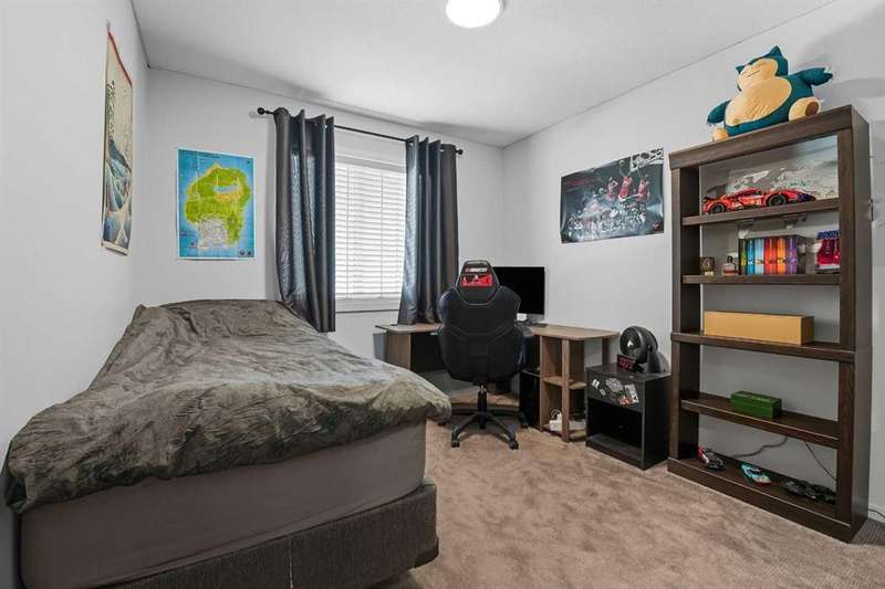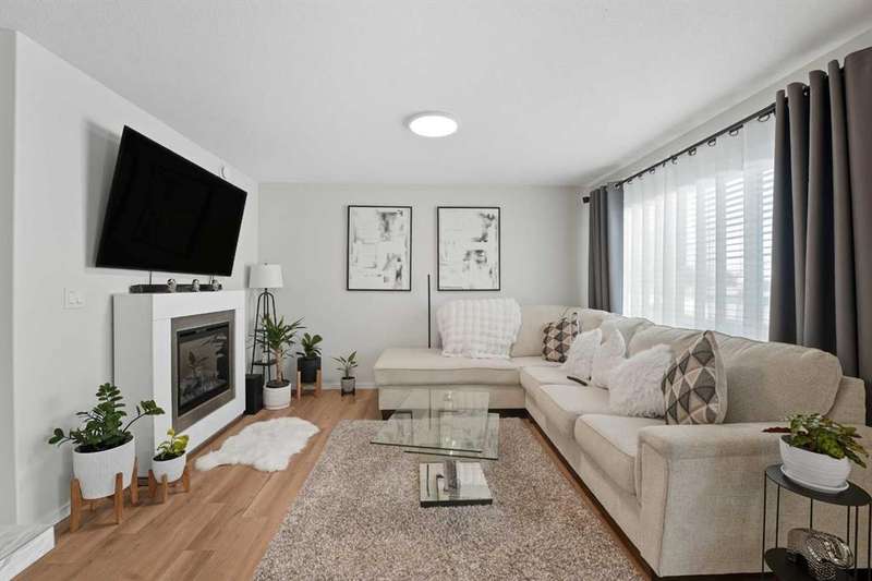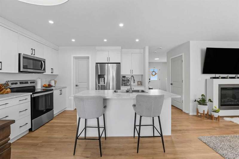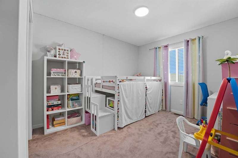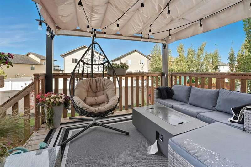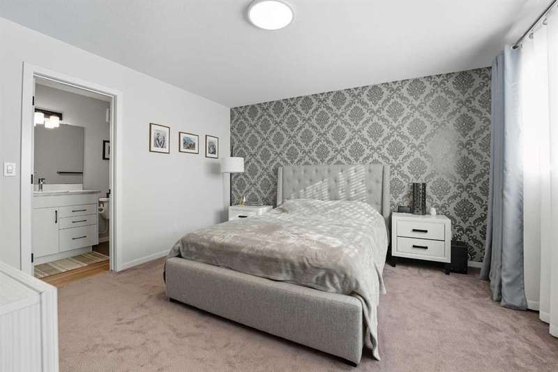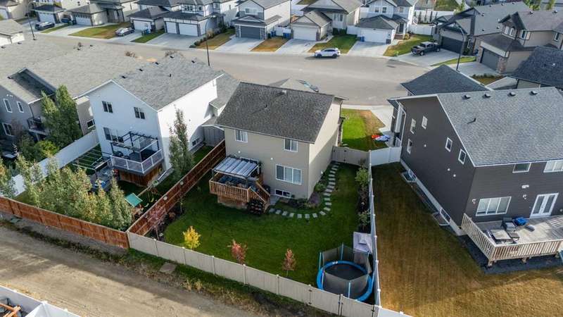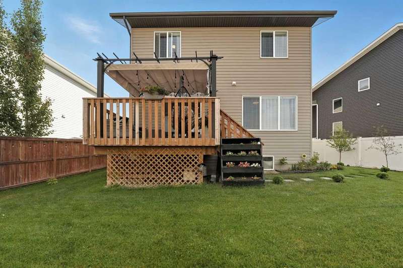 Located in Timber Ridge, this 2-storey home offers an open floorplan with 3 bedrooms up, along with an upstairs laundry room, A/C, and a pie lot! There is vinyl plank flooring on the main level with the upstairs carpeted. The kitchen features white cabinetry that extends all the way to the ceiling, stainless steel appliances, tiled backsplash, walk-in pantry, and an island with an eating bar. The living room receives a ton of natural light from the yard facing West and the dining area includes sliding glass doors leading out to the back deck. The owners have made the deck a very welcome space to unwind after a days work, and includes a pergola and a designated area to BBQ next to the deck. There is a 2 PC bath off the main entry and the garage is painted, along with attached shelving for additional storage. Upstairs, the primary suite gets the morning sun and has a large walk-in closet and a 4 PC ensuite. Two more bedrooms share a 4 PC bathroom, and as mentioned, you have the convenience of an upstairs laundry room. The basement is awaiting your finishing touch. The pie-shaped lot has been beautifully landscaped, with an irrigation system, and comes with maintenance free vinyl fencing. There are Govee decorative outdoor lights installed (smart lighting) on the front of the house that you can change to any colour via the app. If you need trailer parking, that is possible here. Balance of 10 year Alberta New Home Warranty. This home is in amazing condition and in a great neighbourhood!