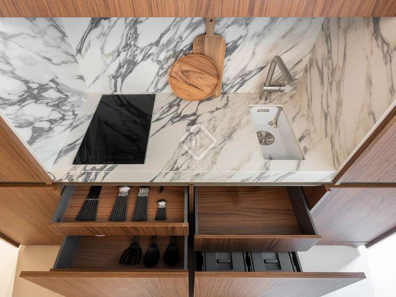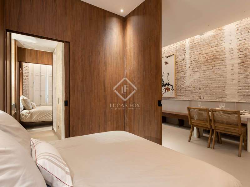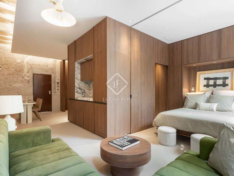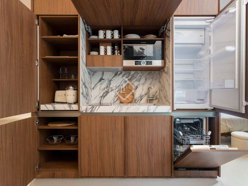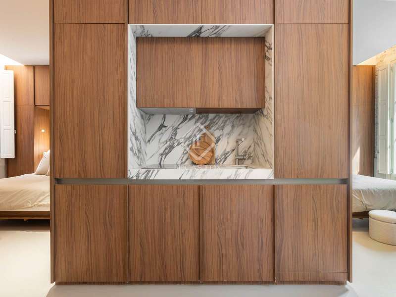 This development is located in the charming Sant Antoni neighbourhood of Barcelona's Eixample district. The classic style building dates back to 1900 and has been completely renovated, offering a lift and attractive communal areas. The communal areas of the building include a gym, parking spaces for bicycles, a wine cellar, a laundry room and a communal terrace with outdoor showers, a lounge and a social bar. The building consists of a basement level, a mezzanine and main floor level, 5 upper floors and a rooftop. Offering twelve apartments and two duplex loft properties, this development provides homes that are fully furnished, equipped and ready to move into. The kitchens come with fitted electrical appliances (dishwasher, oven, microwave oven, coffee maker and refrigerator), Zucchetti taps and porcelain countertop. This 2-bedroom property is on the fourth floor (real height - sixth floor) and is the result of a clever design concept by which a single space may be transformed with a system of sliding panels. The beds can be concealed in closets during the day, and the kitchen and bathroom are at the centre of the home. Feel free to contact us for further information.
