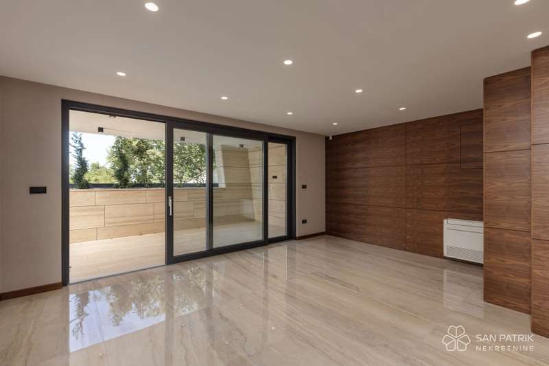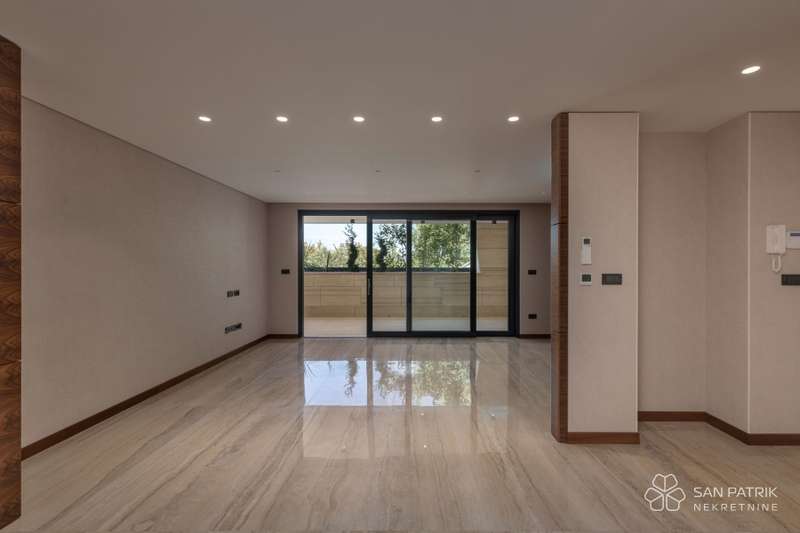 Apartment S1 is located on the ground floor of the villa and consists of: hallway, 3 bedrooms (16.56 m2 + 11.40 m2 + 9.75 m2), 2 bathrooms, toilet, living room, kitchen and dining room, covered terrace, two outdoor parking spaces (PM1 and PM2) and a garden with a heated pool, with a total net accounting area of 122.77 m2.