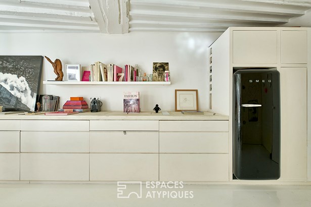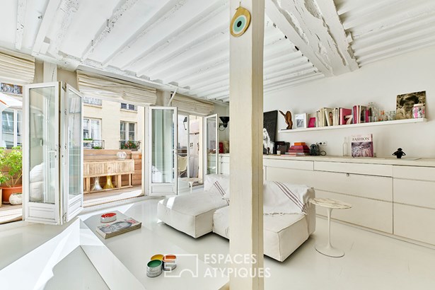 In this part of the Marais district, where time passes by in time with the surrounding galleries, cafes, and boutiques, this unique property stands out for its unique character.
