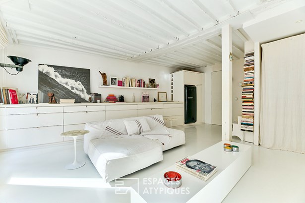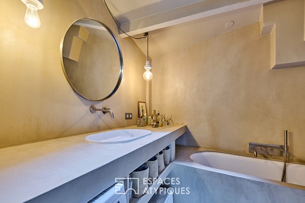 The bathroom, featuring a bathtub and a skylight, completes this space designed as a contemporary cocoon.