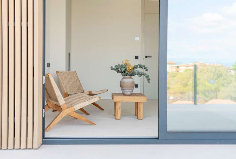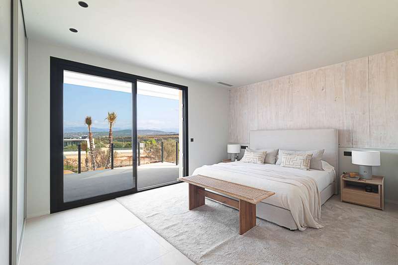 Just 15 km from Palma, in the exclusive residential area of Son Gual and surrounded by an internationally recognized golf course, this magnificent villa combines sustainable architecture with contemporary Mediterranean luxury. Designed by a renowned architect and built with cross-laminated timber (CLT), it offers 350 m² of living space and 195 m² of terraces, set on a generous 2,000 m² plot. The villa features four spacious bedrooms and three elegant bathrooms. The master suite comes with its own en-suite bathroom and private balcony, while two bedrooms share a modern bathroom and a guest bedroom is complemented by a separate bathroom. The interiors are enhanced by a designer kitchen from Cocinart, fitted with premium Siemens, Miele and Bora appliances, and finished with high-quality Dekton flooring. An elevator connects the underground garage with the living areas and the expansive roof terrace, from which one can enjoy breathtaking views of the Bay of Palma and the Sierra de Tram