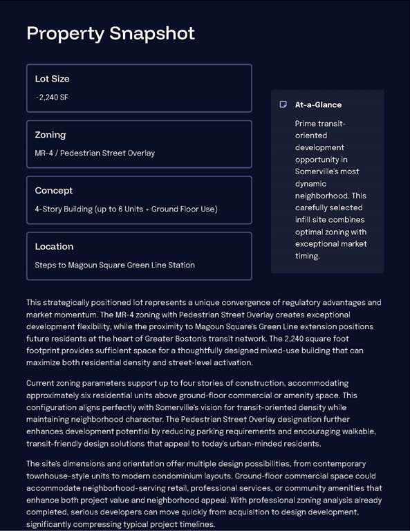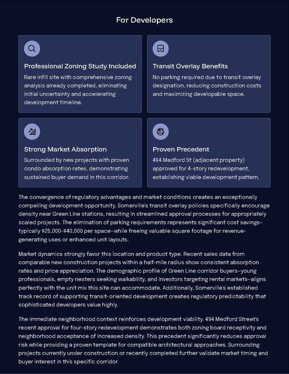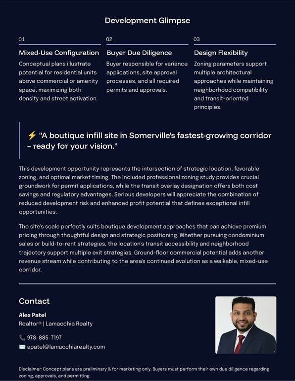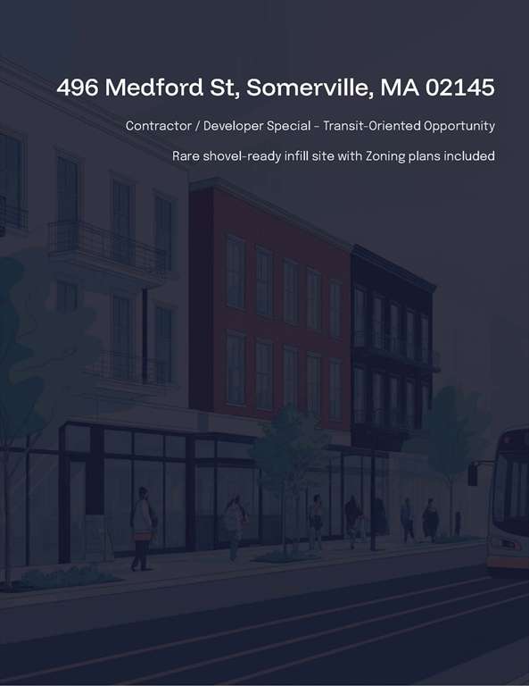 Prime TOD opportunity in Somerville’s vibrant Magoun Square, steps from the Green Line Extension. This 2,240 SF MR-4 zoned lot with Pedestrian Street Overlay allows up to 4 stories—ideal for a mixed-use project with approx. 6 residential units above ground-floor commercial or amenity space. No parking requirements and flexible design standards support a walkable, transit-friendly concept aligned with the city’s smart growth vision. The lot’s dimensions allow for modern condo or townhouse-style layouts. Ground floor and basement are well-suited for retail, amenities, or storage, maximizing value and livability. Zoning analysis completed—developers can move quickly to design and permitting. A rare blend of timing, location, and zoning flexibility in one of Greater Boston’s most in-demand neighborhoods. Strong market comps, buyer demand, and local precedent make this a standout infill opportunity.