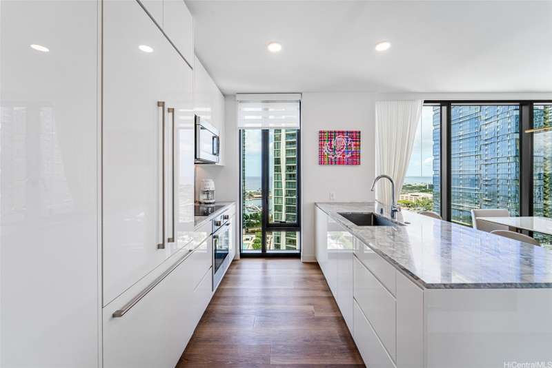 Experience luxury living at A’ali’i, where ocean views greet you the moment you enter. The rectangular shape “01” stack offers the only corner 2-bedroom, 2-bath units with floor to ceiling windows, allowing you to enjoy stunning views from the living room, kitchen and bedrooms. This fully furnished TURNKEY home designed by Rottet Studio includes its own 37 sq ft STORAGE ROOM on the 22nd floor, an EV charger equipped parking with extra overhead storage, an upgraded TOTO washlet, two walk in customized closets, Bosch appliances, and blackout shades in both bedrooms. A wide range of amenities including an outdoor sky deck, spacious gym, yoga room, BBQ areas, large pool and jacuzzi, event rooms, are all extensions of your living space. A’ali’i represents luxurious, sustainable, and well-designed living in one of the most sought-after locations at Ward Village in Honolulu.