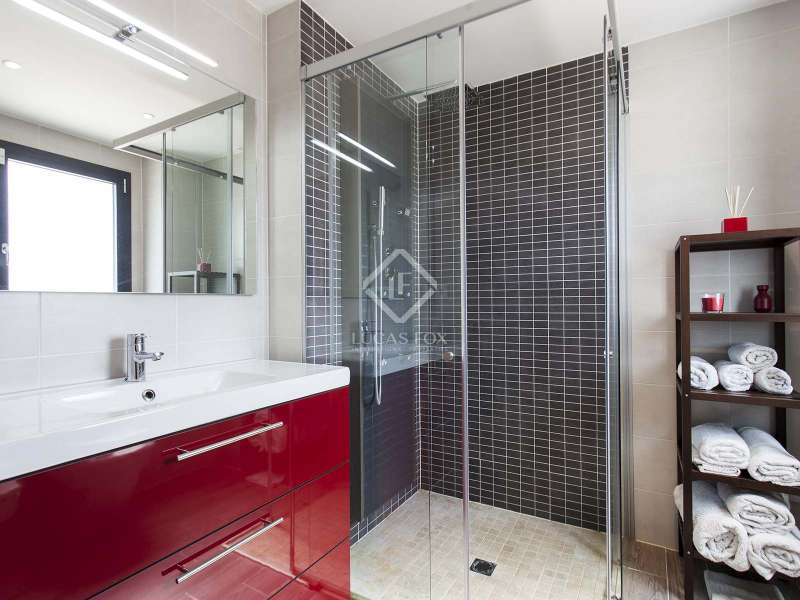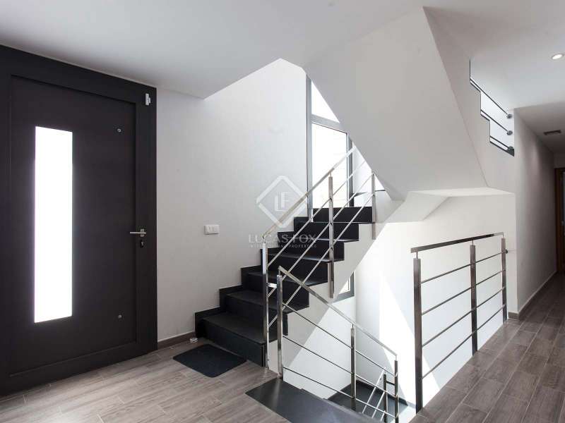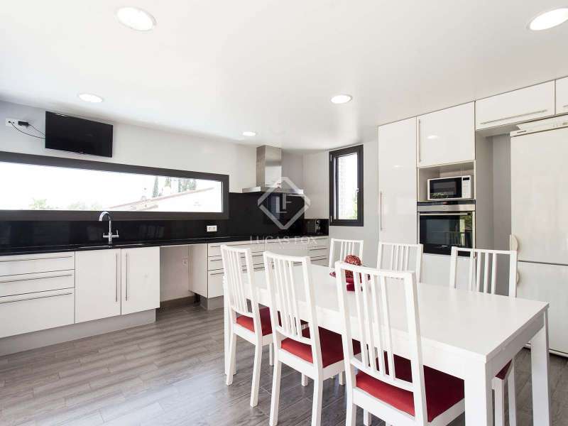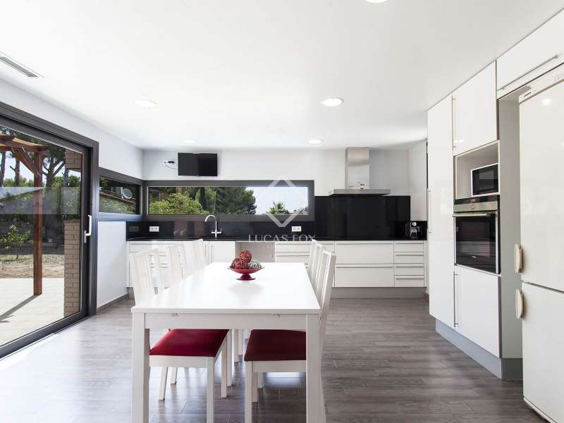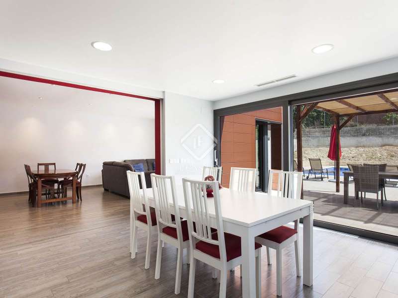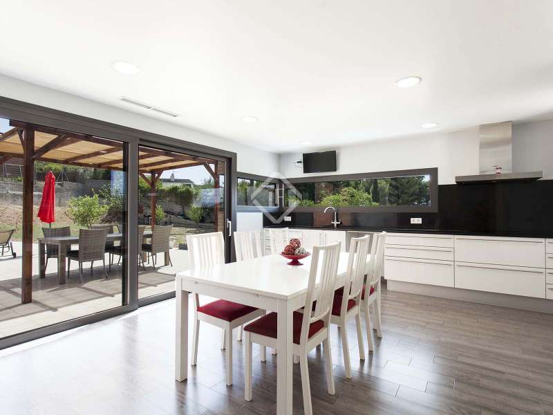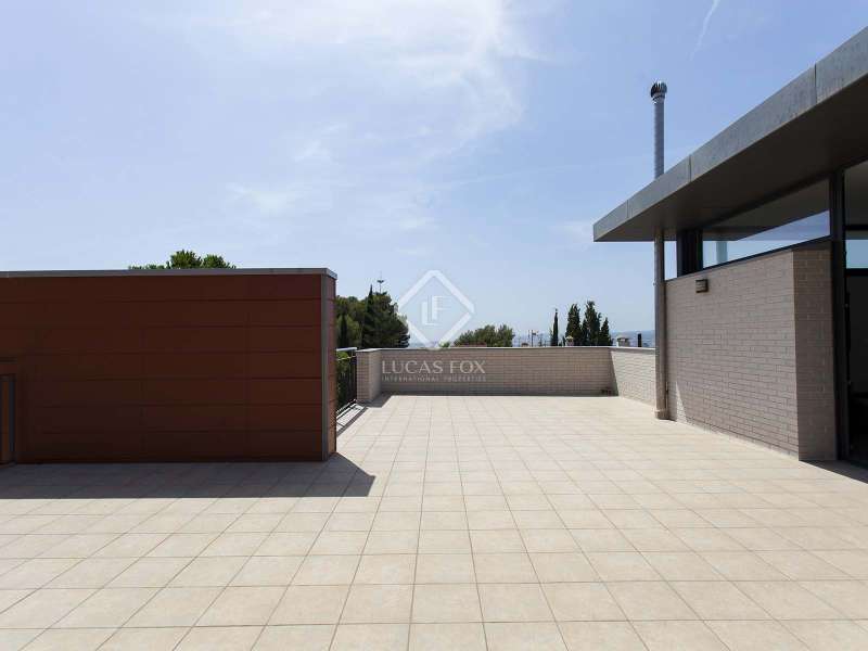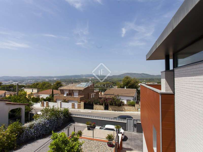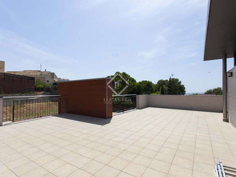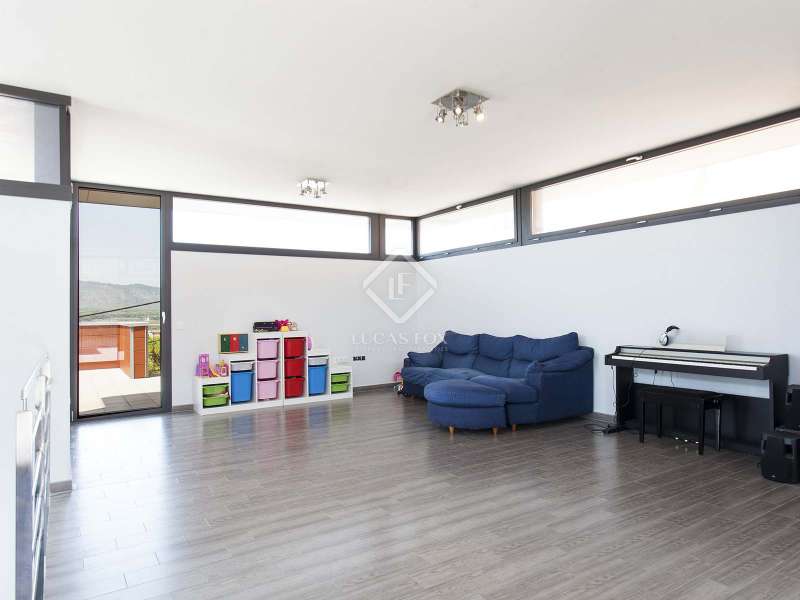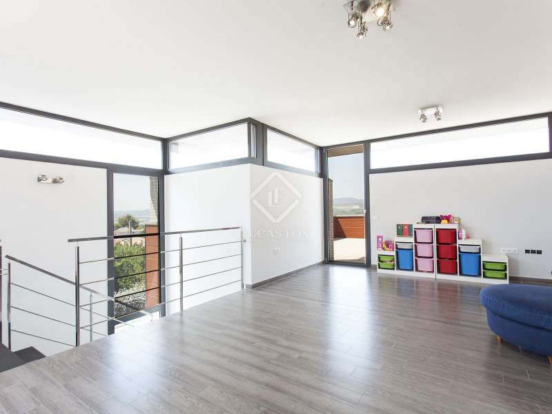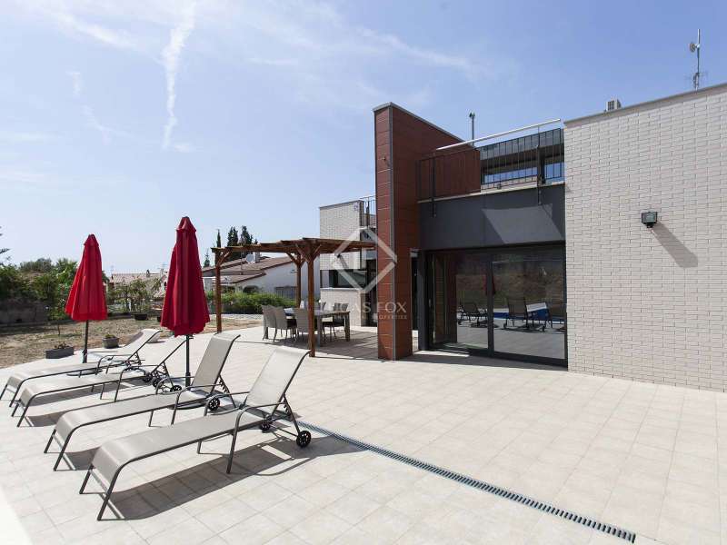 Modern 363 m² villa with very bright, spacious rooms and a cutting-edge design with clean lines and minimalist interiors in the Mas d'en Serra neighbourhood of Sant Pere de Ribes. It is within easy reach of local amenities, the coast and the airport. Built in 2012 the property is presented in excellent condition. Outside we find large terraces and a wonderful swimming pool with views of the surrounding hills. When entering the first floor on the right hand sidewe have the living-dining room and the open kitchen with access to the garden and pool. In front of the entrance door there is a utility room and a bathroom. On the left there is a corridor which provides access to the 2 double bedrooms and the master suite with its private bathroom. On the second floor there is a big open room of 55 m² which may be divided into 2 further bedrooms if necessary. This large room has 2 terraces, one at the front and another one at the back, of approximately 40 m² each. The 2-car garage is found on a lower level at the entrance of the property. The house has been finished to an excellent standard with underfloor heating, air conditioning and double glazing. An unusual modern villa with great, airy, bright living spaces in a prestigious residential area near Sitges.
