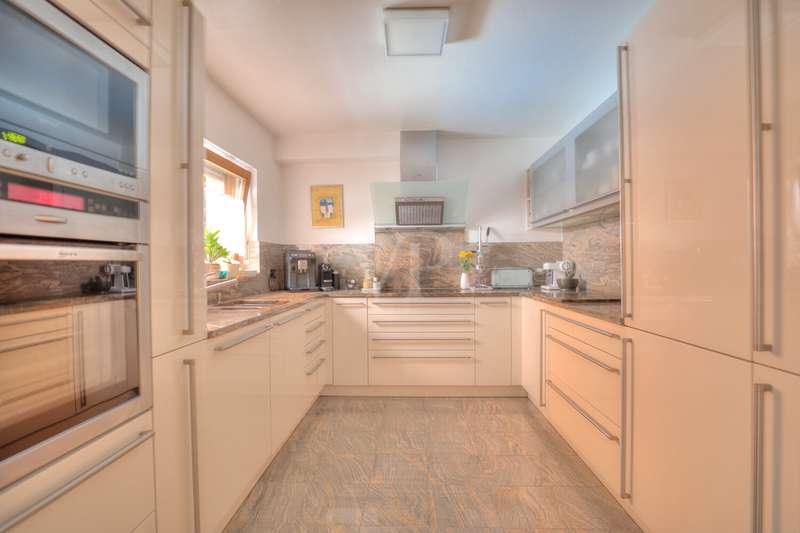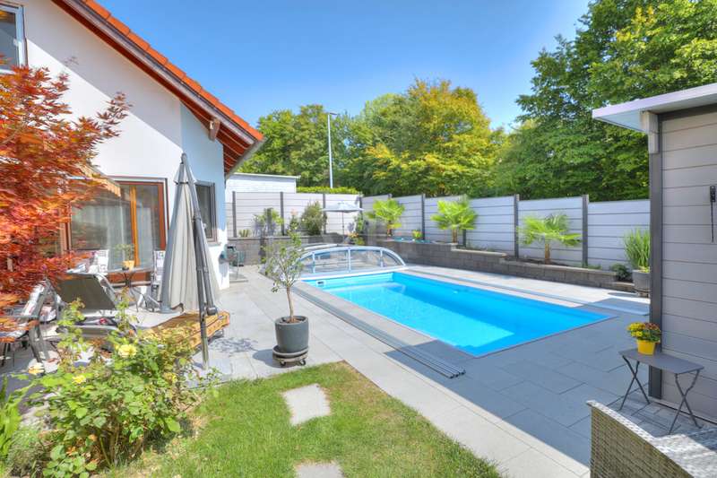 Living, relaxing and versatile - spacious property with sauna, pool and units for the whole family This exceptional property with a living area of approx. 280 m² is situated on a plot of approx. 382 m² in a quiet location at the end of a cul-de-sac. Built in 1992 and continuously maintained, the property impresses with its well thought-out room layout, well-kept condition and numerous modernizations that have been carried out in recent years. The house extends over three levels and offers a total of seven rooms and several clearly structured living units. On the first floor there is a spacious 3-room apartment with direct access to the terrace and the lovingly landscaped garden as well as a pool with sauna. The top floor offers another, slightly smaller 3-room apartment with an inviting loggia. There is also a 3-room granny apartment in the basement, which opens up a wide range of possible uses - whether for guests, family members or for renting out. The focal point of the house is the large living and dining area on the first floor, from which you have direct access to the outside area. There you will find a well-tended garden, a swimming pool, which was modernized in 2022, as well as a sauna, which will be expanded in 2025. This will add attractive wellness facilities to the property. Numerous modernizations have been carried out in recent years. The heating system was renewed in 2022 and is supported by a modern solar thermal system, which ensures efficient water heating. The outdoor area was also redesigned in 2022. In 2023, high-quality laminate flooring was laid on the upper floor and the bathroom on the first floor, which had already been modernized in 2019, was added. Further measures followed in 2024, such as the renovation of a bathroom, the replacement of bedroom furniture, the modernization of parts of the kitchen and the sealing of the panels on the loggia. Various options are available for your vehicle fleet. There is a parking space right next to the house, supplemented by another official visitor parking space. A garage offers additional comfort and secure protection for your vehicle. The quiet cul-de-sac location ensures a pleasant living environment with little traffic. Despite the idyllic surroundings, shopping facilities, doctors, bus connections and an S-Bahn connection are just a few minutes away. This ensures a high quality of life and flexibility in everyday life. The house is equipped to meet modern standards of comfort and functionality. In addition to central heating with solar thermal energy, you benefit from high-quality fixtures and fittings in the kitchen and bathroom. Thanks to the clearly demarcated units, the property is suitable for families who want to live together yet separately, as well as for investors who are thinking of renting out or generating additional income. This well-kept apartment building combines contemporary living comfort with well thought-out interior design and versatile usage options. Come and see the special advantages of this property for yourself during a viewing. We look forward to hearing from you.