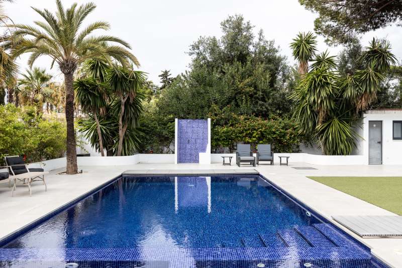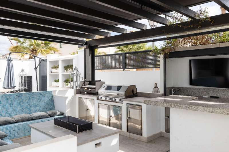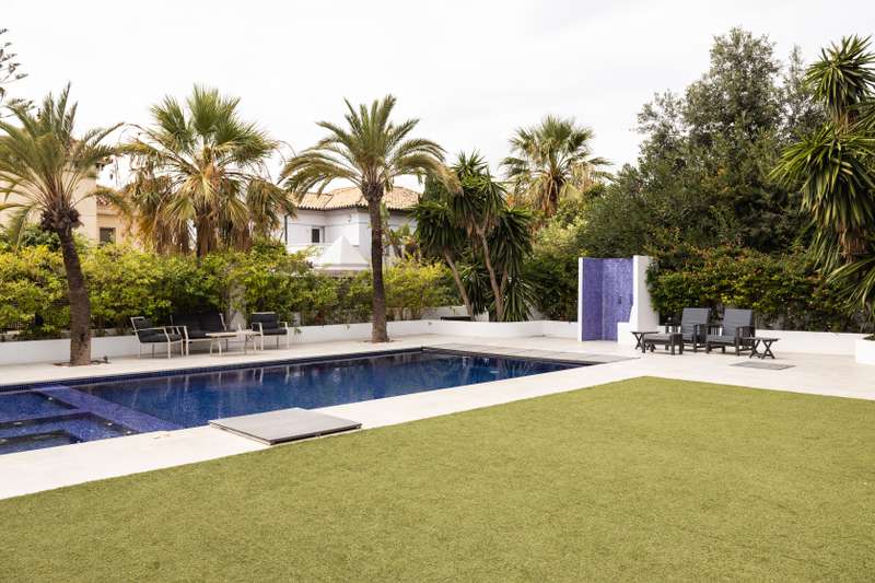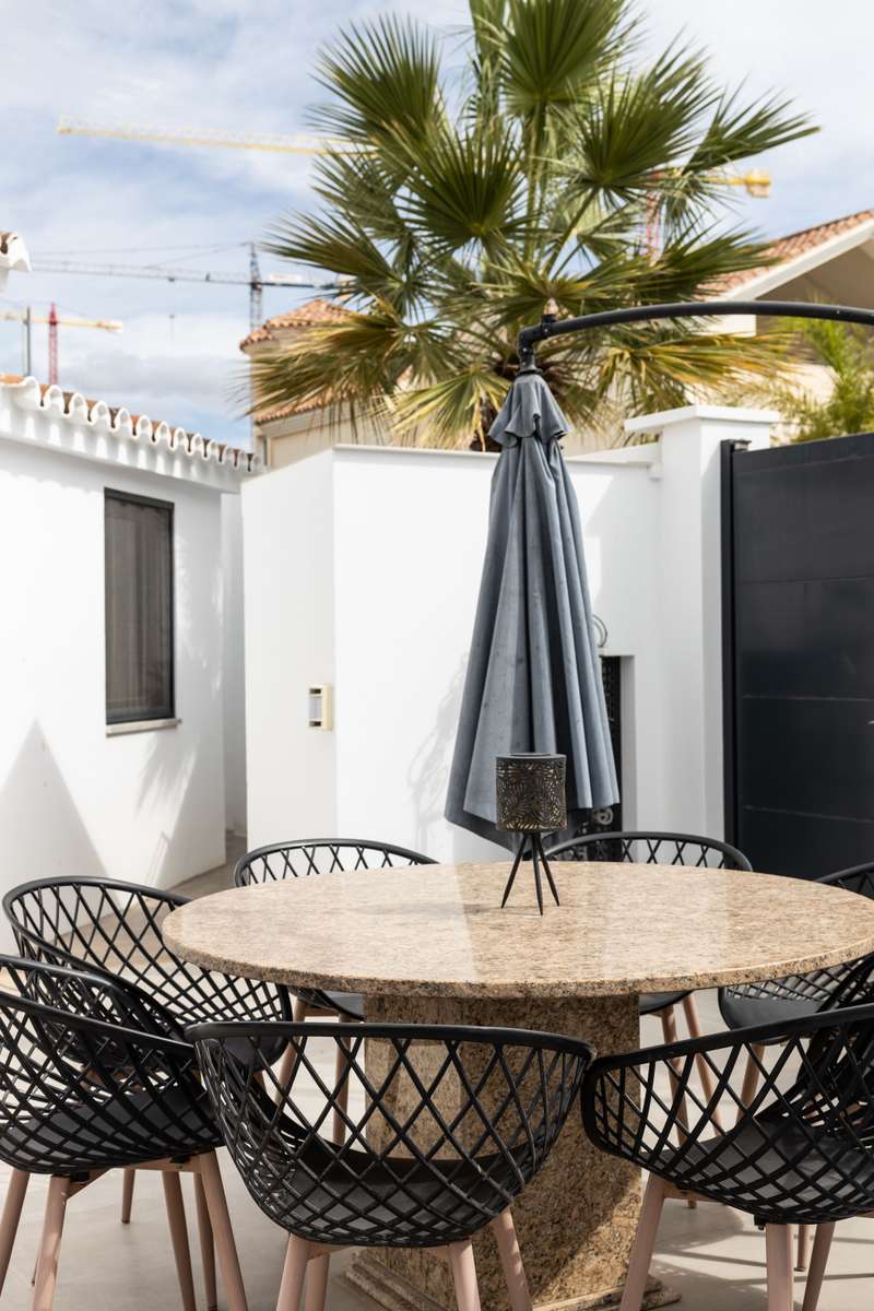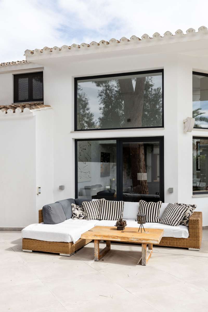 This exquisitely refurbished villa enjoys an enviable location just 180 meters from the pristine sandy shores of Las Chapas Playa. Offering five sumptuous bedrooms and four impeccably appointed bathrooms, it is nestled on an expansive, south-west-facing plot, with every convenience and leisure facility merely a short walk away. The outdoor living experience is unparalleled, featuring a generously proportioned entertainment area complete with a state-of-the-art kitchen and bar. Equipped with both gas and charcoal barbecues, a flat-screen TV, and a cozy fire pit, this sophisticated space is designed for all seasons. Ingeniously, the area can be fully enclosed to ensure year-round comfort. Meticulously refurbished with uncompromising attention to detail, the villa exudes timeless elegance and modern functionality. The main floor unveils a luminous, double-height living room with soaring floor-to-ceiling windows, seamlessly connecting to a partially covered terrace. Adjacent lies a fully