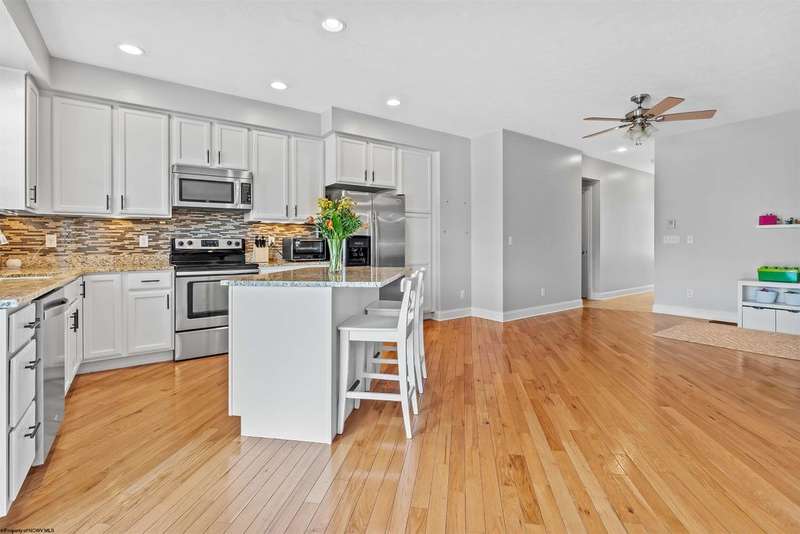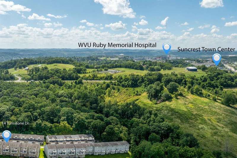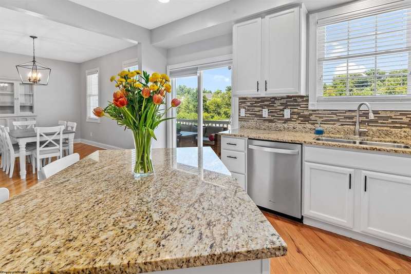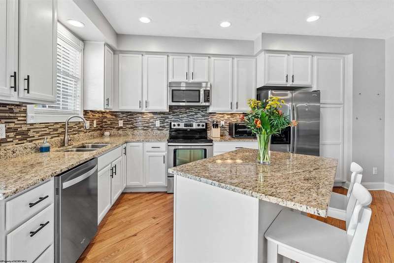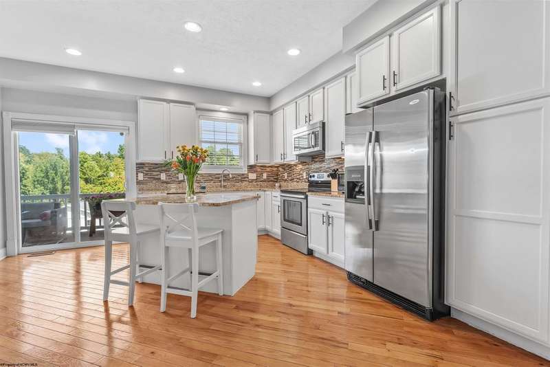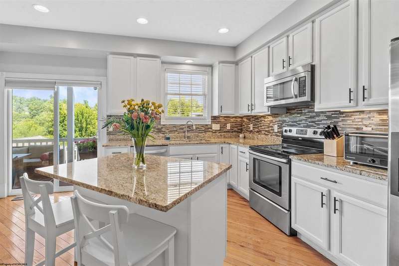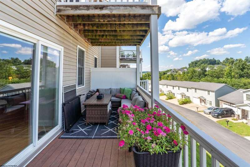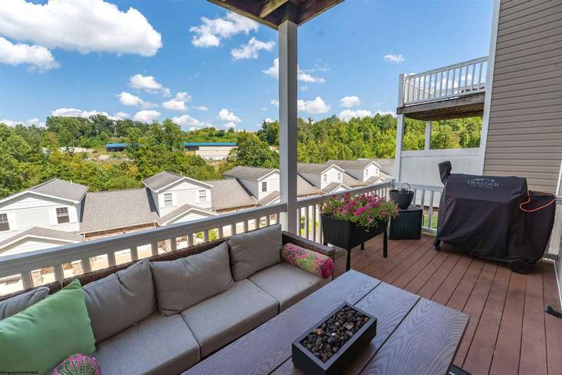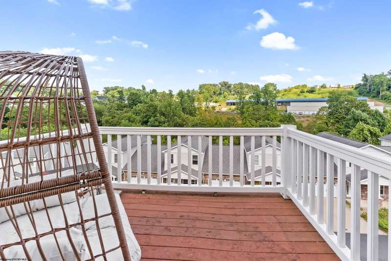 This 3-bedroom, 4-bathroom townhome is just minutes from Ruby, Mon General, and West Virginia University in a quiet location with easy access to I-68/I-79. 9ft+ ceilings throughout and real tongue-and-groove wood floors highlight the charm and quality that prevail throughout this property, making it a luxury-style townhome with little upkeep. The main level features semi-open concept layout with a living room that surrounds a gas fireplace. The kitchen is styled with granite countertops, under-cabinet lighting, an island with bar and is gas range ready. Adjacent to the kitchen is a large deck for outdoor dining with expansive valley views. A semi-formal dining area sits across from the kitchen and living spaces. On the second level you'll be greeted by a large landing, a utility room, full bathroom and three spacious bedrooms with oversized closets and windows. The primary bedroom features an ensuite and attached deck large enough for a complete patio set or snoozing under the stars. The true centerpiece of this property is the fully finished basement with attached deck, complete with a kitchen, utility room, office, full bathroom and two spacious multi-purpose rooms complete with oversized closets.