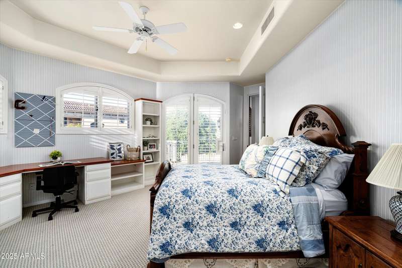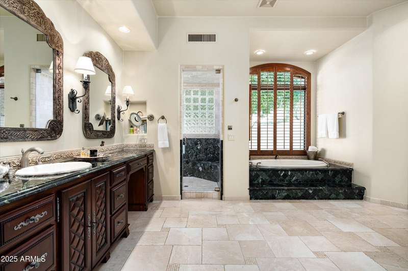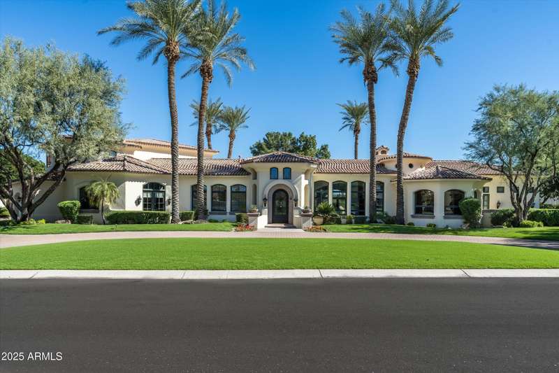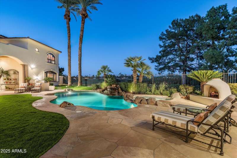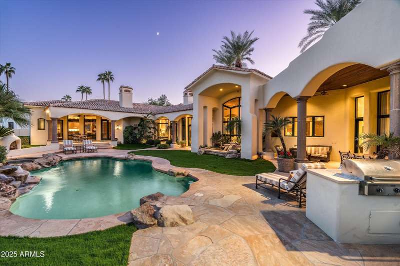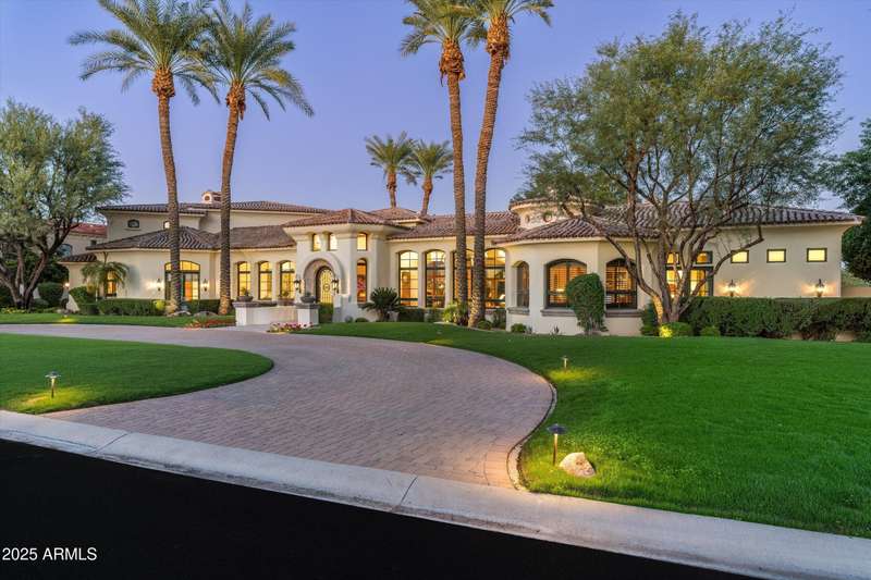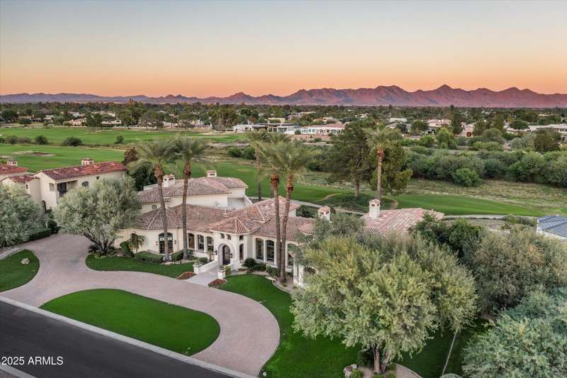 Perfectly positioned on a beautiful private lot within the gated community of Hidden Paradise, this stunning golf course home overlooks the 9th hole of Camelback Country Club, offering privacy, exceptional mountain views, and refined desert elegance. The main level features a spacious primary suite with an adjacent office on one side of the home, and a large guest bedroom on the west wing. Upstairs are three additional en-suite guest rooms, each with its own balcony capturing sweeping views of the McDowell Mountains. Guest house located across the backyard offering privacy. Thoughtful craftsmanship, custom woodwork, and timeless design by Lee Hutchison AIA Urban Design Associates. The owner's suite includes a steam shower, dual vanities, private courtyard access, and abundant closet. The gourmet kitchen is appointed with a Viking 6-burner range, Sub-Zero refrigerator and freezer, Dacor double ovens with warming drawer, and dual dishwashers. Additional highlights include a wet bar, with ice maker and beverage refrigerator, motorized light-sensing shades, large floor to ceiling windows that capture incredible sunsets over the mountains, central vacuum, and a 4-car garage with an enormous amount of storage. A guest house features a full kitchen, Murphy bed, and living room,ideal for guests or multi-generational living. Outdoor amenities include a heated 10-foot-deep diving pool, a spa, basketball area, outdoor fireplace, and large covered patios. The landscaping frames the surrounding mountains and fairways. With its remarkable setting, thoughtful layout, and resort-inspired outdoor living, this home embodies the ultimate in luxury, privacy, and Paradise Valley living.