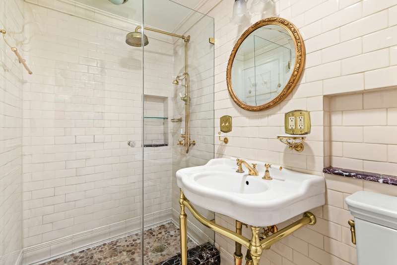 The large open kitchen features a ;one-of-a-kind, original porcelain-glazed sink, vintage brass hardware, new marble countertops, a warming drawer, large pantry, counter seating, and high-end stainless appliances, including a Sub-Zero fridge. A full bathroom with a step-in shower honors the period details of the home while providing modern comfort.