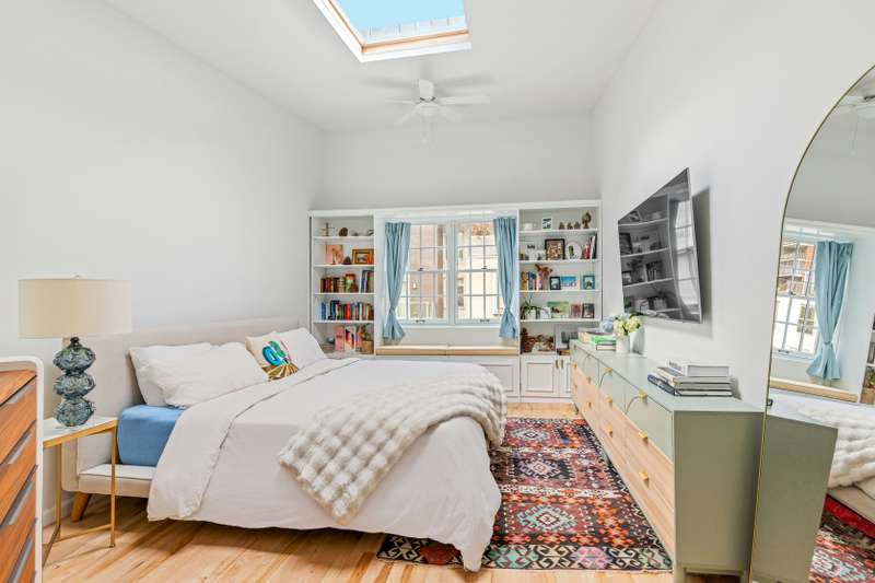 Upstairs, a curved solid wood staircase leads to the second floor with soaring 11'6" ceilings and three skylights - one in each room. The ;primary bedroom is oversized and bright, with a cozy window seat and room for a super-king bed plus a desk or reading nook. The second bedroom, currently used as an art studio, fits a queen bed and additional furnishings, plus its own walk-in closet. ;A beautiful second full bathroom - worthy of a five-star hotel - features an XL soaking tub, linen closet, and deep under-tub storage, completing the upstairs layout.