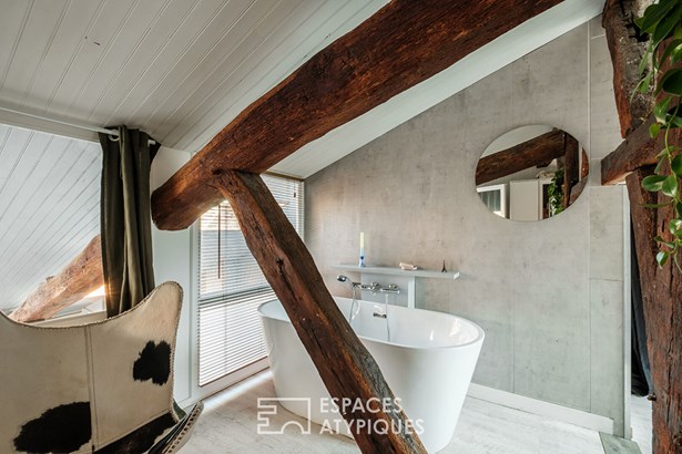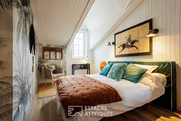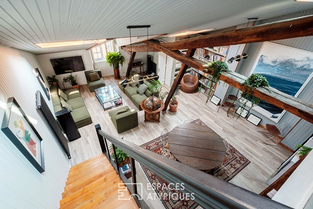 It houses an office and a bathroom that interacts with the exposed beams, while offering a spectacular view of the historic volumes of the living room. In the immediate vicinity of the market, the arcades, the old port and the train station, this characterful apartment will be the ideal starting point to fully enjoy the charms of the city.
