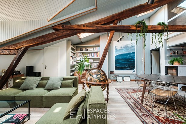 Within this listed building, without an elevator to preserve its soul, a 16th-century staircase invites you on a journey through history to reach the third floor, reserved exclusively for this duplex. A separate entrance allows for a comfortable and private arrival. The bright living room with its four skylights benefits from generous volumes.