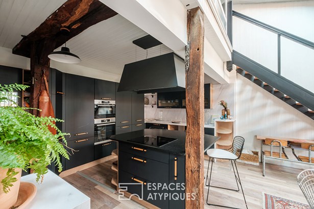 In a pure loft spirit, the open kitchen is harmoniously arranged around its central island. Particular attention has been paid to the nobility of the materials as well as the integration of multiple custom-designed storage units.