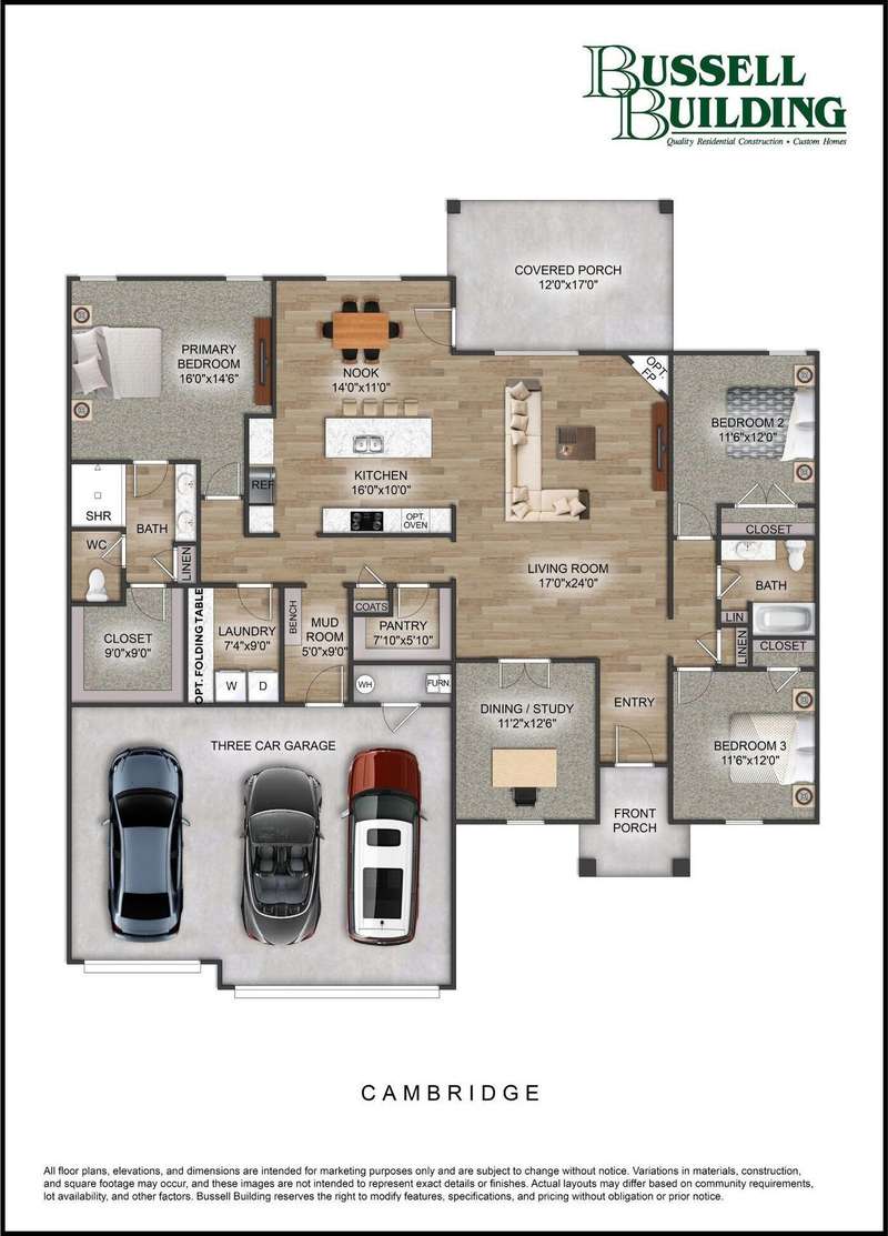 The Cambridge offers over 2,200 sq. ft. of thoughtfully designed living space, perfect for families or entertaining. The expansive front porch makes a bold statement, offering a grand welcome while providing the perfect spot to relax and enjoy the outdoors. Inside, the open-concept layout seamlessly connects the living room, kitchen, and dining nook, creating a warm and inviting atmosphere. The luxurious primary suite features a spacious walk-in closet and en-suite bath, while two additional bedrooms and a versatile study provide flexibility for any lifestyle. Complete with a three-car garage and a covered back porch, the Cambridge balances sophistication with practicality. *Photos may be of a similar home*
