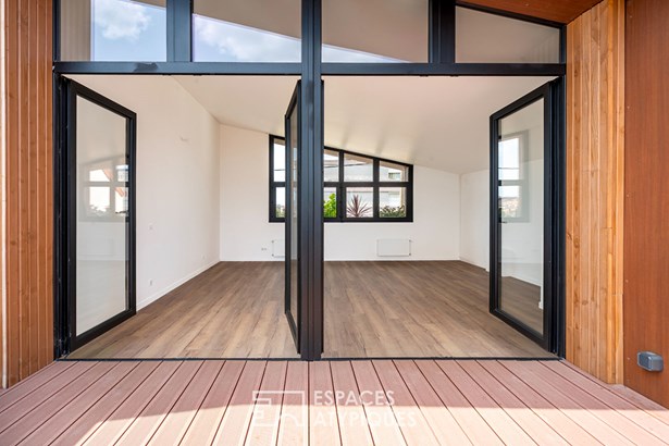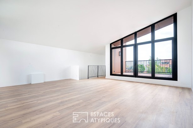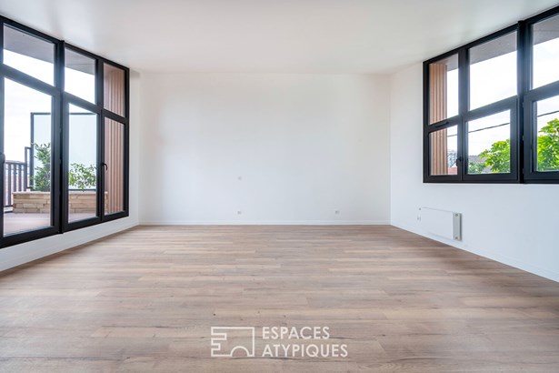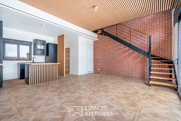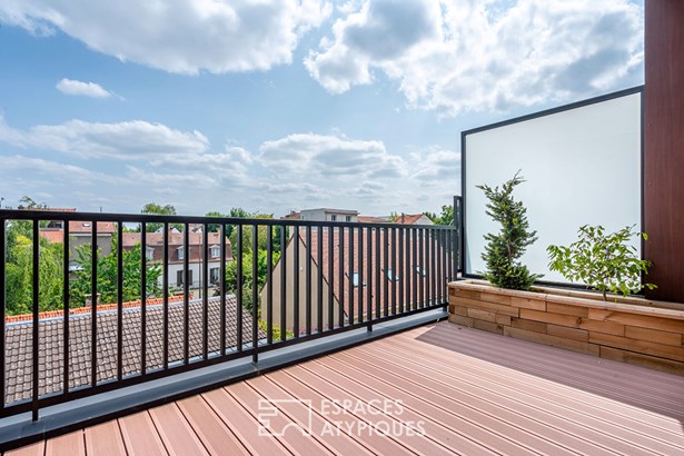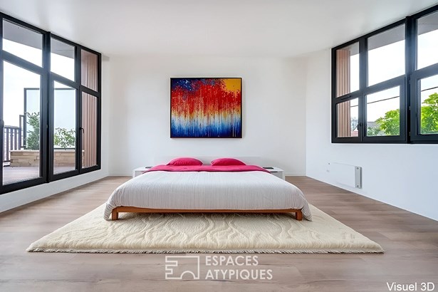 In the heights of Vitry-sur-Seine, on the edge of the Lion d'Or district of Villejuif, this new 128 m2 house rises over three levels, offering a rare opportunity to live in an architect-designed house just a few minutes' walk from the metro (line 7), with the added bonus of uninterrupted views of the Parisian monuments.