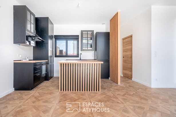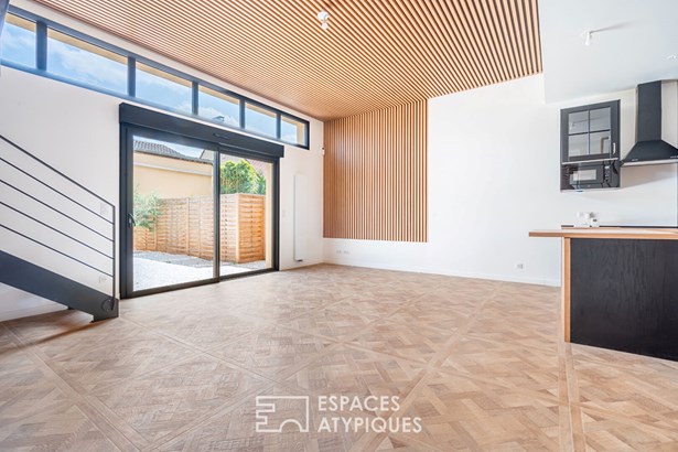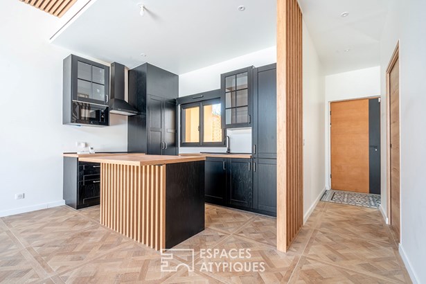 The ground floor features a discreet but functional entrance hall with cupboard, guest WC and utility room, creating a fluid transition to the living area. Bathed in light by a bay window topped with transoms, this room boasts 3.40 m high ceilings and opens onto a garden of around 60 m2. The kitchen, with its central island, has a natural place here, with a direct link to the social areas.