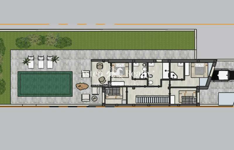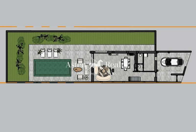 On the ground floor, there is private parking within the property, a private garden, and a 6×3 m pool in emerald tones.