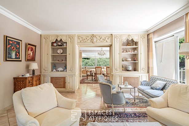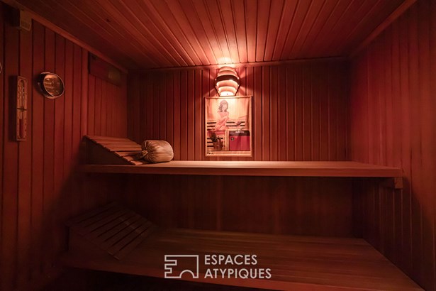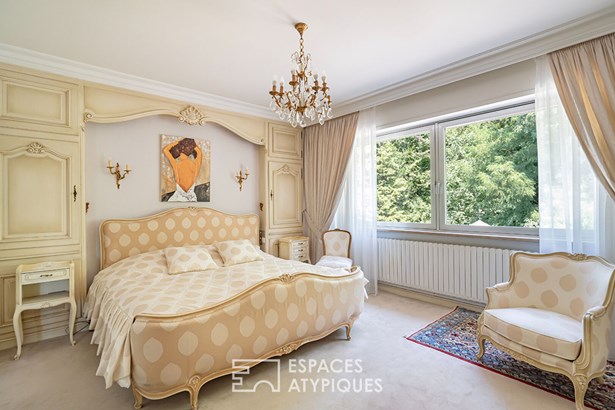 La maison s'organise sur deux niveaux. Le rez-de-chaussee accueille un hall d'entree spacieux qui dessert un vaste salon baigne de lumiere, sublime par une cheminee sculptee en pierre et des boiseries raffinees. Dans son prolongement, une salle-a-manger et une cuisine independante sont connectees par un grand balcon filant oriente sur le jardin. Ce niveau comprend egalement un espace nuit compose de deux chambres, d'une spacieuse salle de bains avec douche et baignoire, d'un bureau et d'un debarras. En rez-de-jardin, les volumes sont tout aussi genereux : un salon bar, une seconde salle-a-manger, un garde-manger et un espace bien-etre comprenant une piscine interieure (a remettre en fonctionnement), un sauna, un solarium et un acces direct au jardin. Une chaufferie, un garage double en enfilade, une cave a vin ainsi qu'un logement deux pieces avec entree independante completent ce niveau.