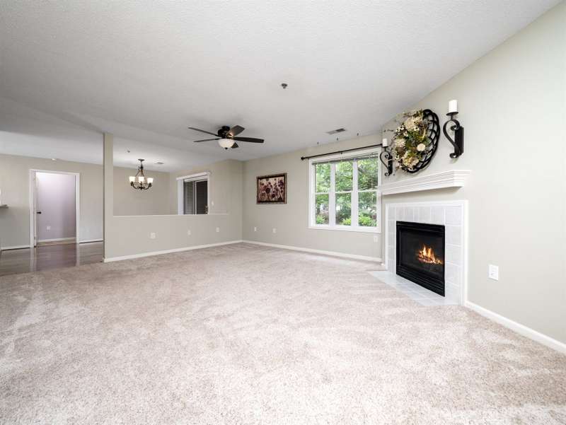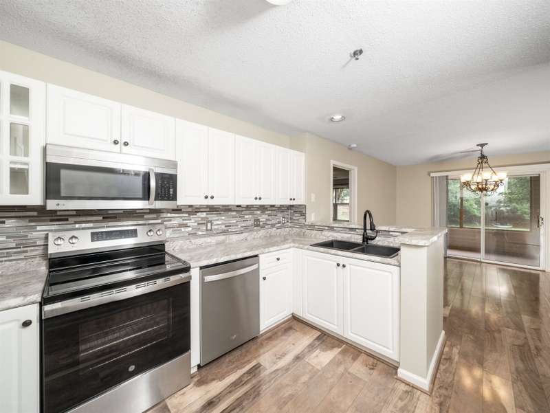 Charming 2 bedroom, 2 bath condo in sought after community- RARE main level location! Don't miss this adorable condo that offers a perfect blend of comfort & convenience. You are greeted by a nice size family room with a gas fireplace. Enjoy an open concept floorplan that allows ease of entertaining. A secondary bedroom is located at the front of the home with a full bath. There is a nice size breakfast nook that's open to the kitchen. Kitchen has plenty of white cabinets, stainless steel appliances, glass subway tile backsplash, pantry & a breakfast bar with room for stools. There's also a large laundry/utility room that's great for storage needs. The owner's suite is also a nice size & features a walk-in closet. The ensuite bathroom is large and offers a double vanity sink, walk in shower and separate soaking tub. Sip your coffee or curl up with a book and enjoy the screen porch and private serene backyard view. One of the best spots in the neighborhood! The home has a separate storage unit to the right of the front door that's easily accessible. Whether you're a first-time buyer or looking to downsize this condo offers a perfect blend of comfort & ease! Perfect spot to bike or walk to the neighborhood pool & parks, coffee shops, gyms and plenty of restaurant options. Amenities galore! You can't beat this location! The listing has been virtually staged.