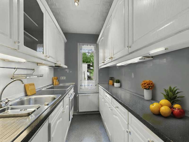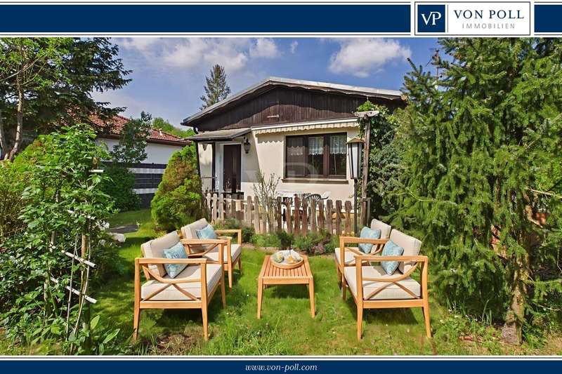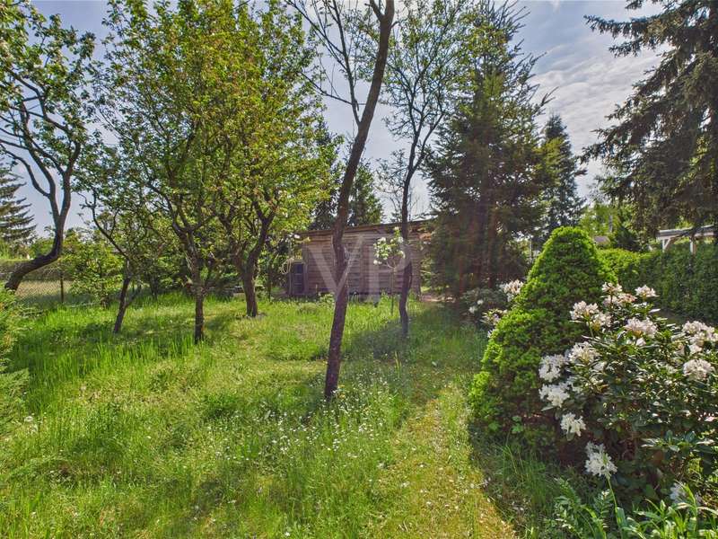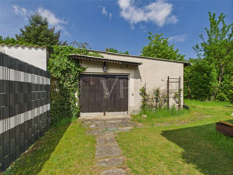 PLOT AND HOUSE: For sale is a solidly built bungalow on an idyllic building plot with a size of approx. 796 m². The living space of the bungalow is approx. 77 m² and is suitable for permanent living. Another alternative would be to build your own dream home, e.g. a two-storey detached house. The property is within walking distance of the Müggelspree. The property is located in a traffic-calmed residential street and the immediate residential area is characterized by well-kept detached houses and a good milieu structure. The location close to nature and water is particularly noteworthy. Well-bearing fruit trees and decorative ornamental shrubs enrich the garden of the new owners. A manual gateway with a spacious front garden provides access to the property. To the right is a newly built carport, straight ahead is the driveway to the solid garage behind the house. The new owner can add their own design ideas to the front garden. The property is fully fenced and has access to all utilities. There is further usable space available in the garage, e.g. a workshop and other ancillary rooms. The additional usable area is approx. 50 m². In front of the bungalow there is a paved terrace with a manual sun awning. On entering the house, the hallway on the right leads into a bright living room with a view of the garden. Straight ahead is the living room with large windows. Another small hallway leads to the shower room, the kitchen and the bedroom. There is a small storage room off the bedroom that could be used as a dressing room. NOTE: The bungalow is being sold including inventory (as visible in the photos). For a development with a new detached house, §34 BauGB applies, the building must be oriented and blend in with the surrounding buildings in terms of shape and size.