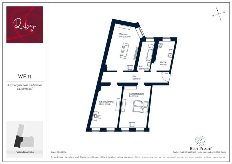 Ruby is a charming Wilhelminian-style building, constructed in 1900 and situated on the serene single-lane Palisadenstrasse. Its red-painted facade, which inspired the building’s new name, is adorned with stucco, adding an extra touch of elegance to this attractive five-story residential and commercial building. Twelve apartments with two to four rooms and living areas of approx. 61 to 101 sqm are located on the property’s 1st to 4th floors. These classic Wilhelminian-style units not only boast desirable apartment sizes but also feature highly efficient floor plans. In keeping with the typical style of Wilhelminian apartment buildings, each unit has a separate kitchen offering space for a small breakfast nook. A majority of the units have daylight bathrooms, most of which are equipped with bathtubs. Additionally, many of the apartments have balconies and, thanks to their south-facing orientation, they provide a tranquil outdoor space to relax in the fresh air and soak up the sunshine. Two apartments on the top floor are currently being renovated. The two commercial units are located on the ground floor and are rented out.