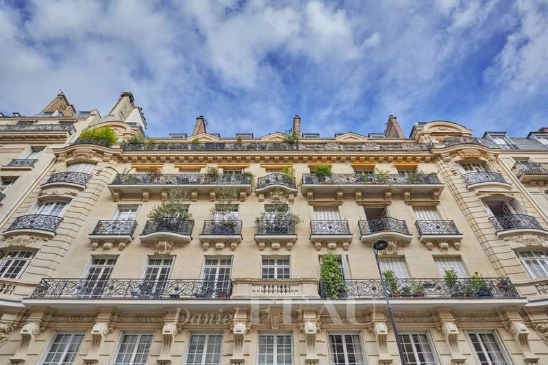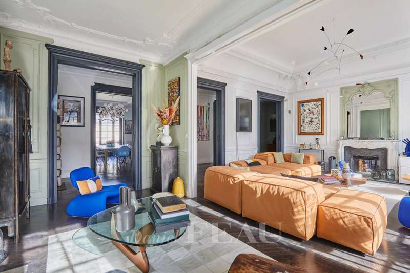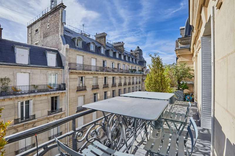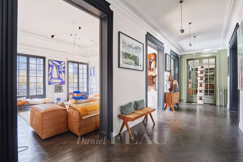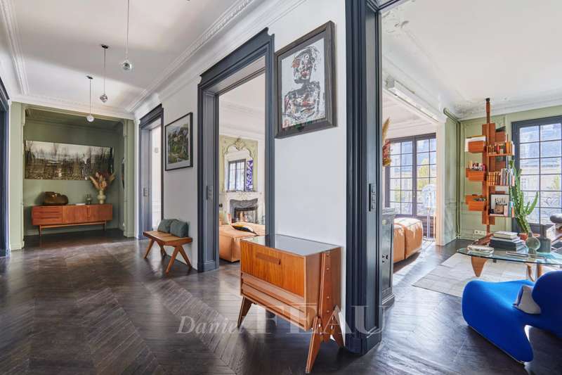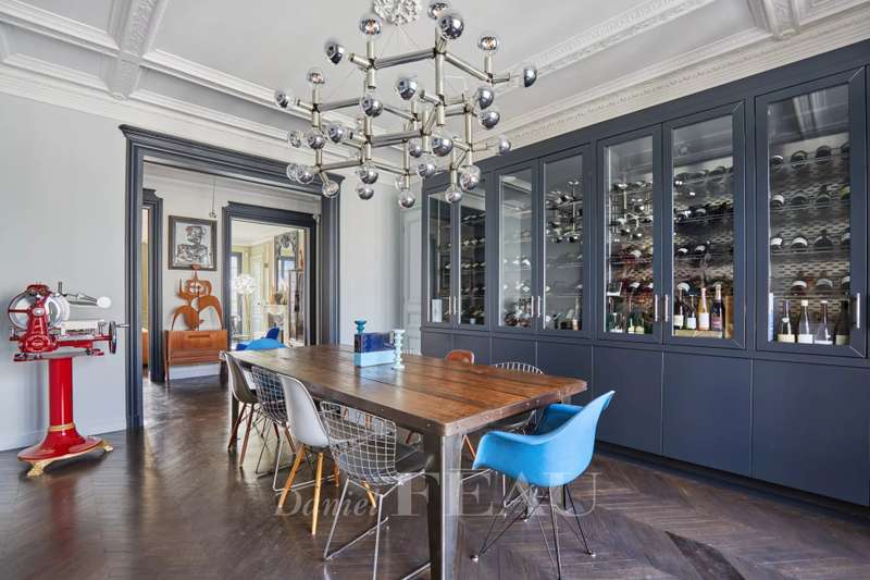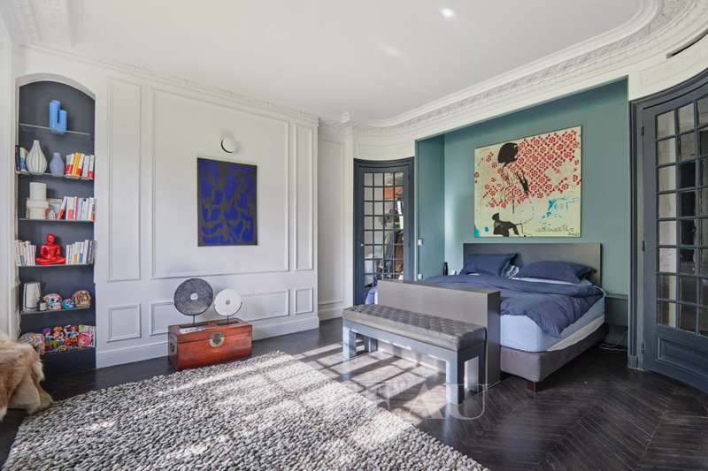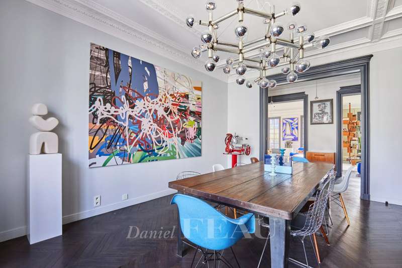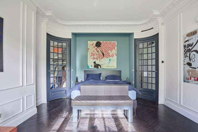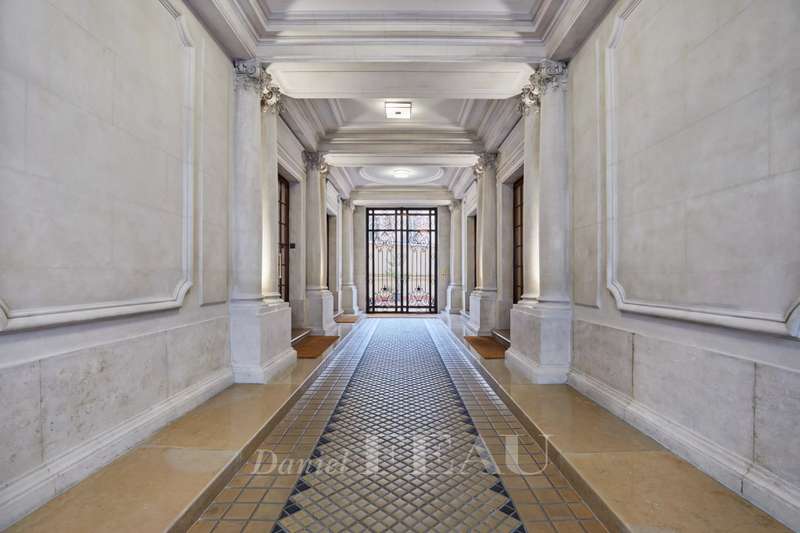 Saint Ferdinand neighbourhood, in the immediate vicinity of the Arc de Triomphe, the shops, the schools and the transport networks. This peaceful dual-aspect apartment on the top floors (5th and 6th) of a very well-maintained early 20th century building with a caretaker and a lift offers 265 sqm of floor space and 255.24 sqm of living space as defined by the Carrez Law. Benefiting from a leafy 16 sqm terrace, it includes an entrance hall, a double living/reception room, a drawing room, a dining room, a kitchen with dining facilities, a master suite with a dressing room, a shower room and wc, a bedroom, a bathroom with a wc, and a utility room. The upper floor comprises two bedrooms, a bathroom/wc, and a landing fitted as a fitness room. Ample fitted storage space. With a parking space and two cellars.