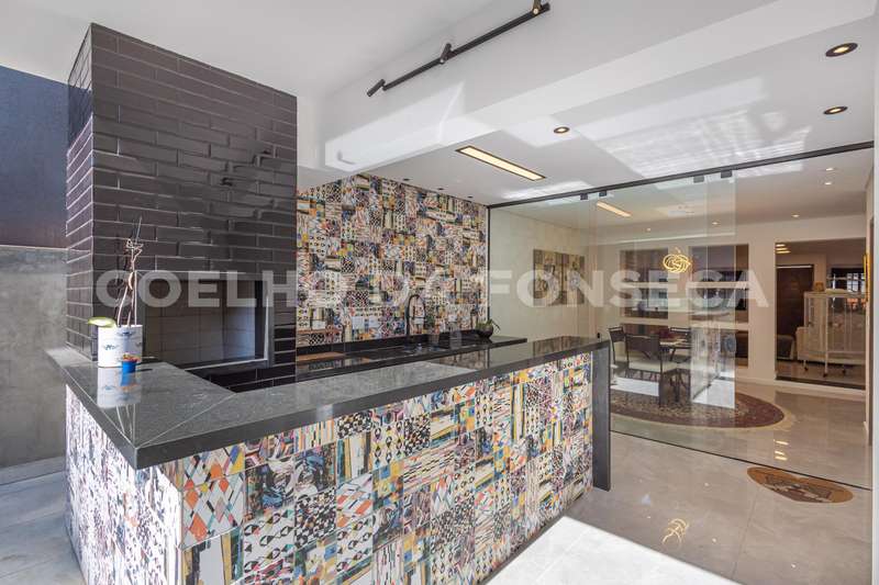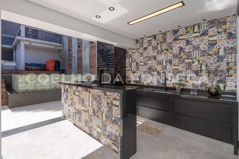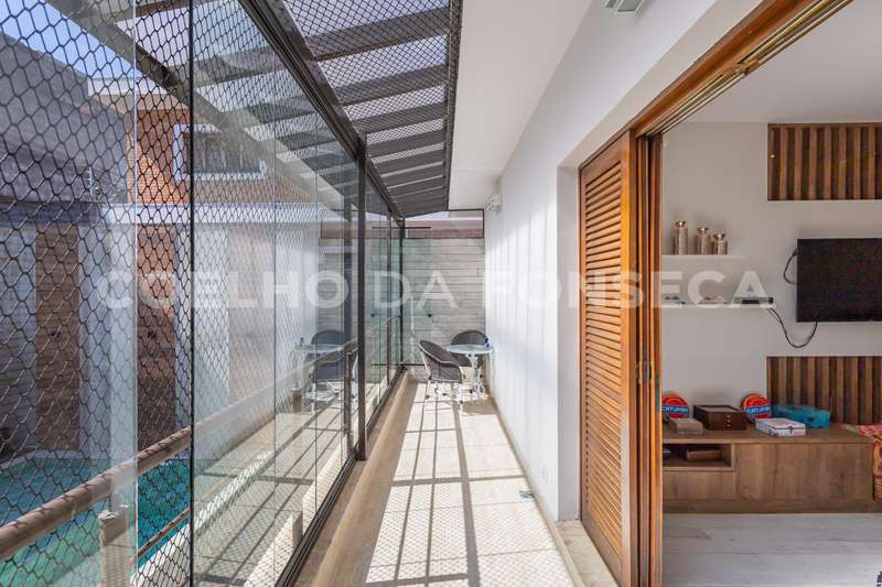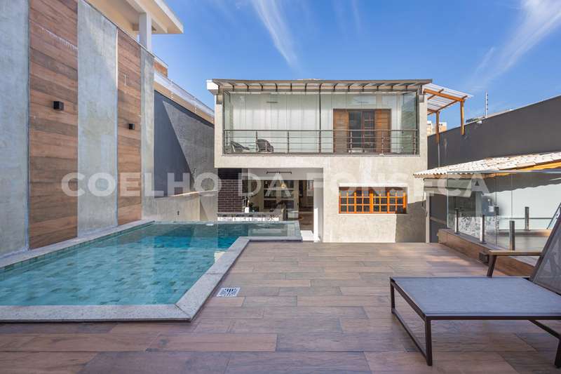 Casa toda reformada com ar de Santorini, uma área externa que vai que inicia com uma piscina com borda infinita e cascata iluminada, subindo para um primeiro solarium e terminando com um espaço onde poder ser feito um espaço fitness.