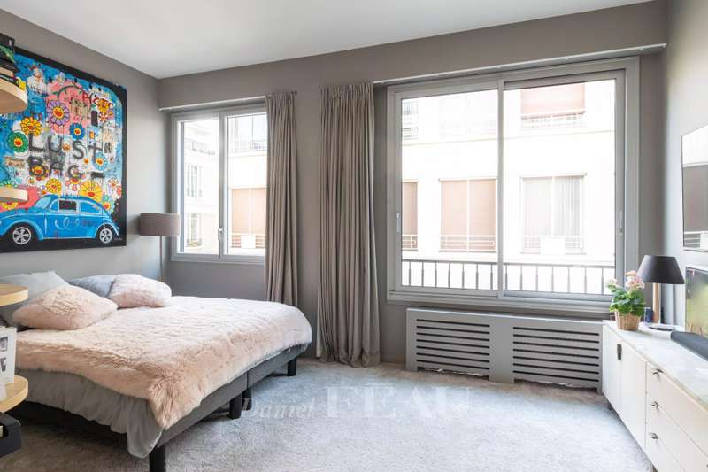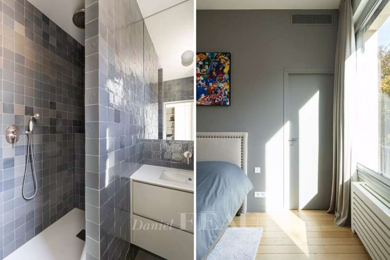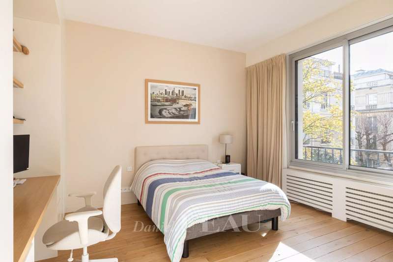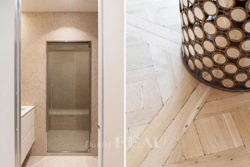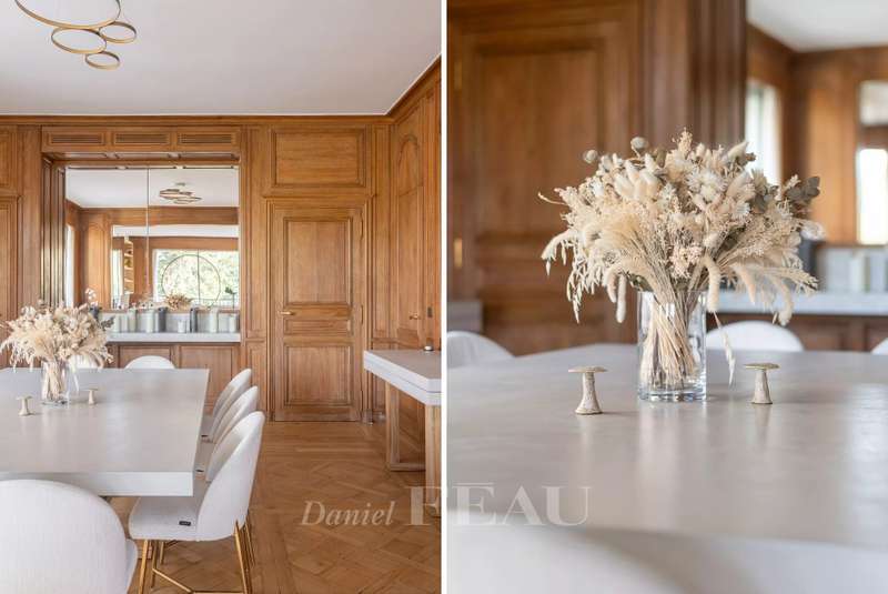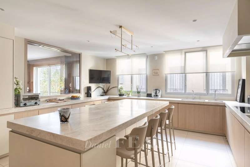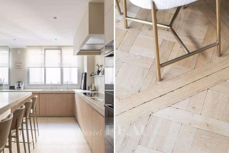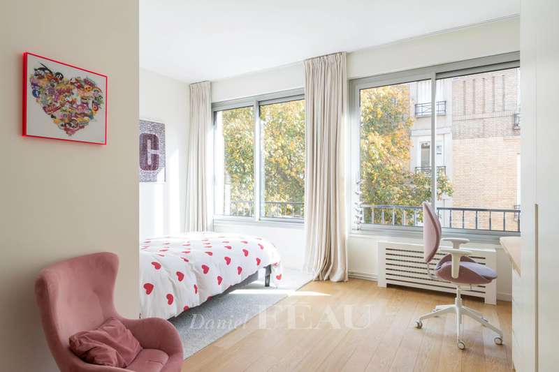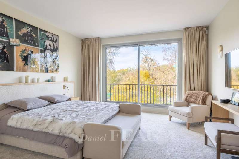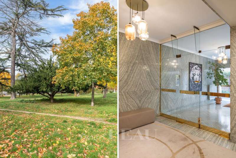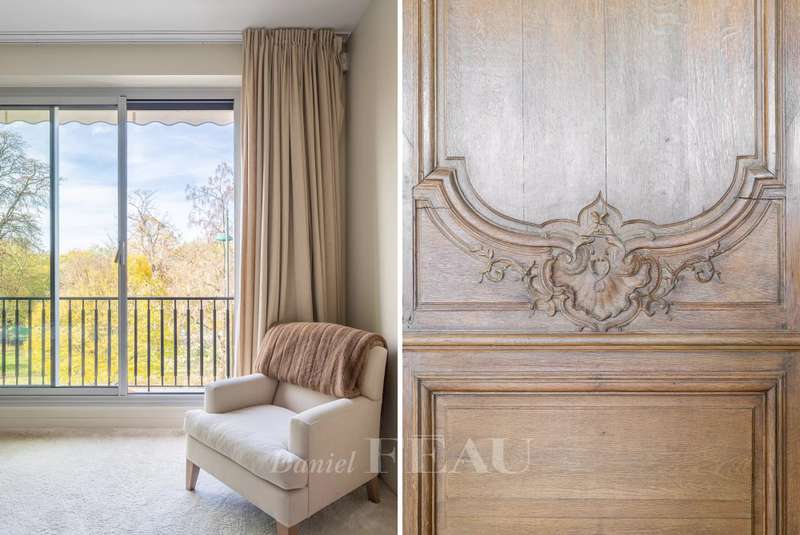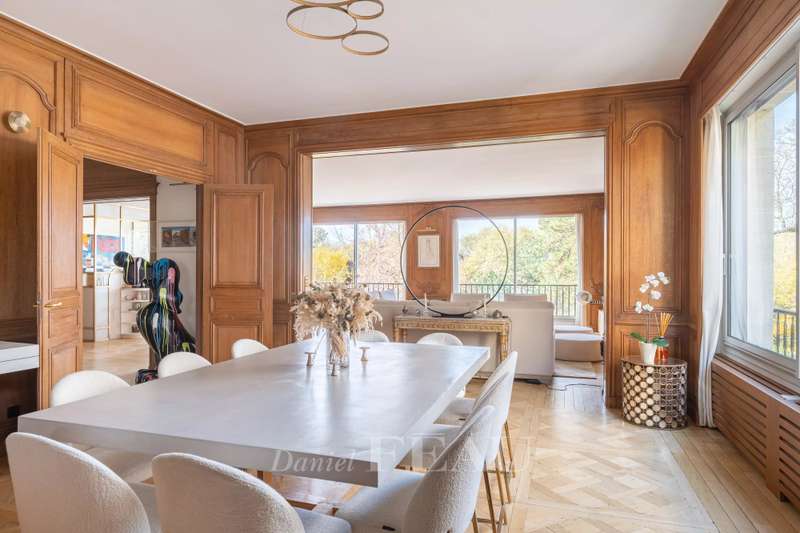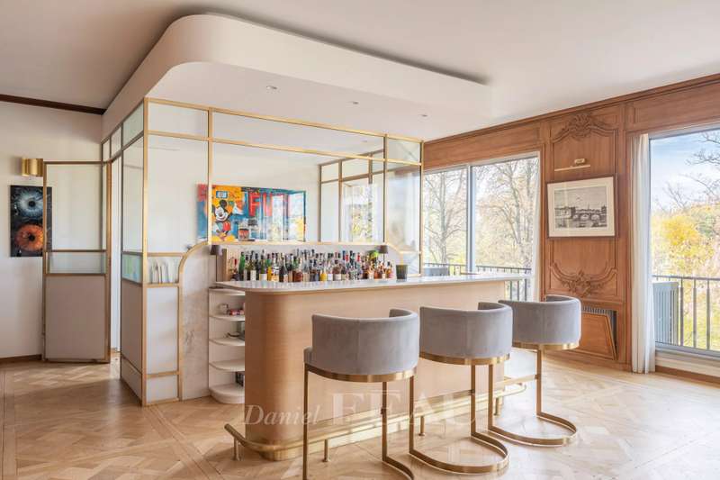 This sumptuous 326 sqm apartment on the 2nd floor of a luxurious and recently renovated mid 20th century freestone building with elegant common areas has been renovated in a contemporary style while preserving original panelling. Particularly bright and enjoying an open view of the Bois de Boulogne, it includes a spacious living/reception room with a dining room and a fully equipped kitchen, four spacious bedrooms each with a bathroom and bespoke storage space, a master suite enjoying a view of the woods, two bathrooms and a spacious dressing room. With two basement parking spaces, a maid’s bedroom and a cellar.