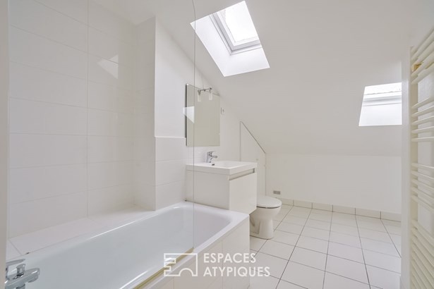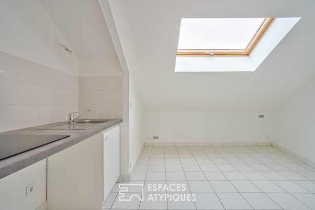 The entrance lit by a skylight leads to the right, the nicely attic living/dining room which measures 15 sqm Carrez (21 sqm on the floor) and benefits from a large storage cupboard, as well as the bedroom of 13 sqm Carrez, ( 14 sqm on the ground) with solid pine parquet flooring.