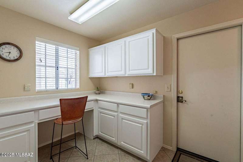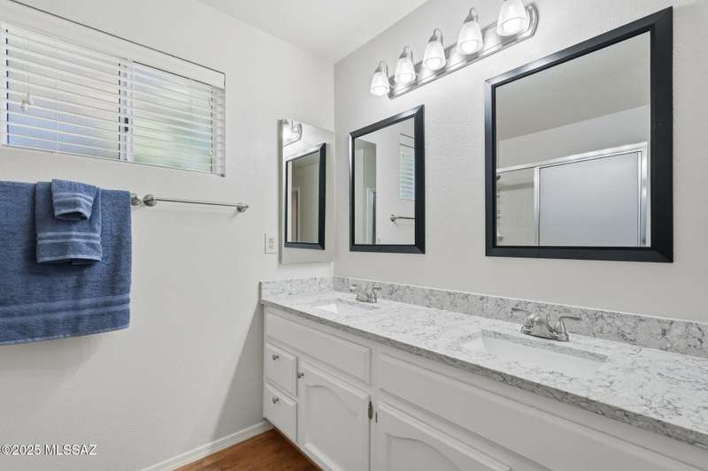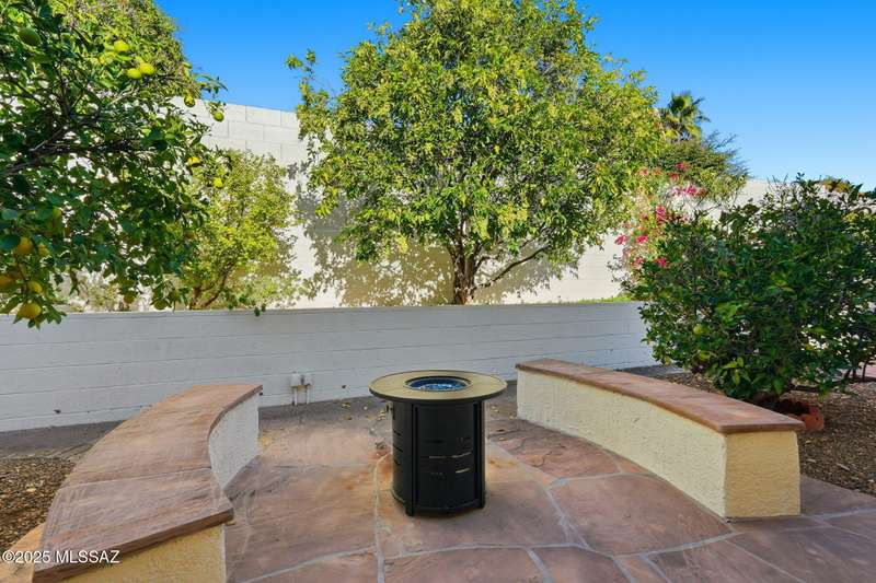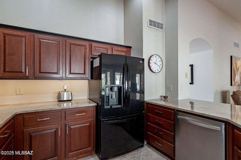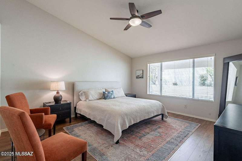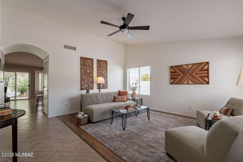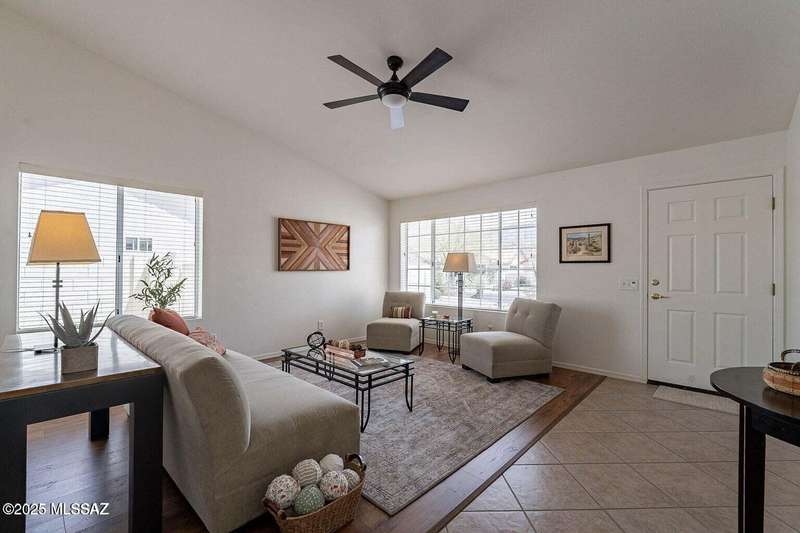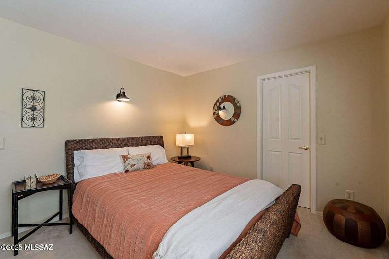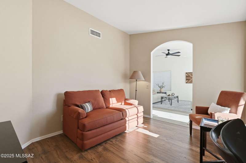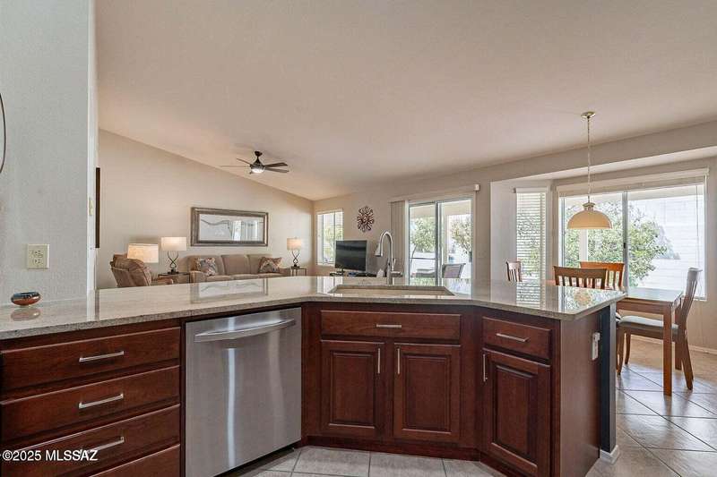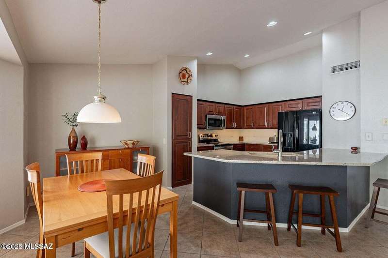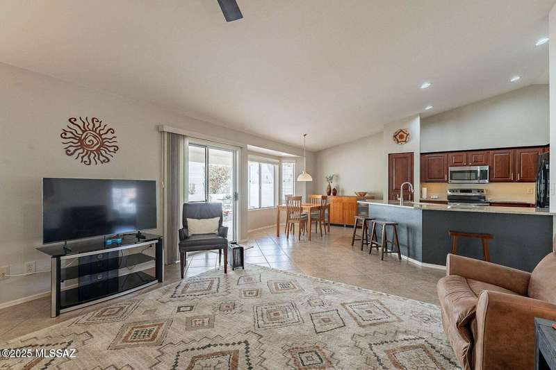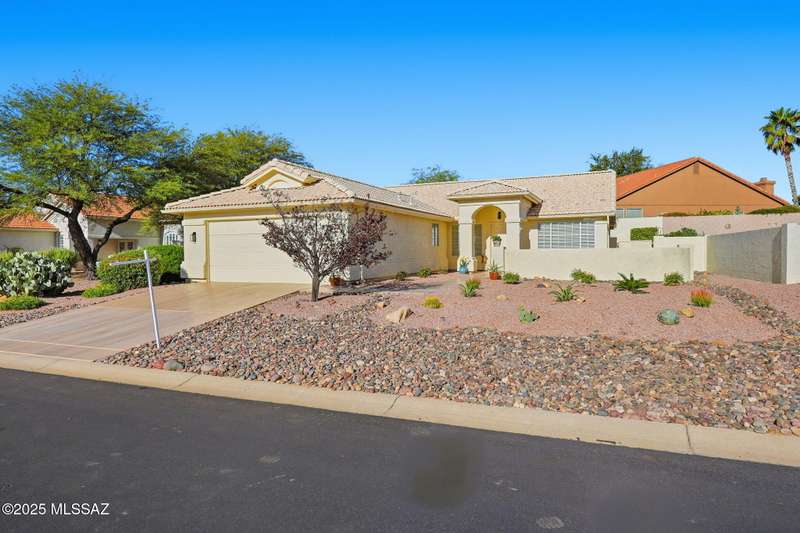Catalina Mountain views from front patio of this Diego floor plan in SaddleBrooke. HVAC (2025), roof underlayment (2022), updated bathrooms w/granite (2025), front patio & landscaping (2025), & exterior paint (2025). 2 bed, 2 bath plus den/office. Beautifully updated kitchen - granite counters, a counter-height breakfast bar with stools, opens to family room. The living room & front patio offer beautiful views. Primary suite features luxury vinyl flooring, dual vanities, two closets, & generous bedroom space. Guest room includes large walk-in closet & cozy carpet. Step out back to cozy, private backyard w/full-length covered patio, extended paver patio, citrus & elevated planter w/lush bougainvillea. Lovingly maintained. Move in and enjoy!