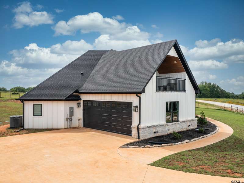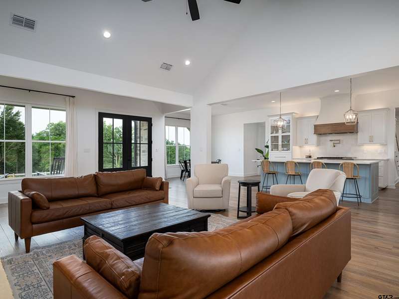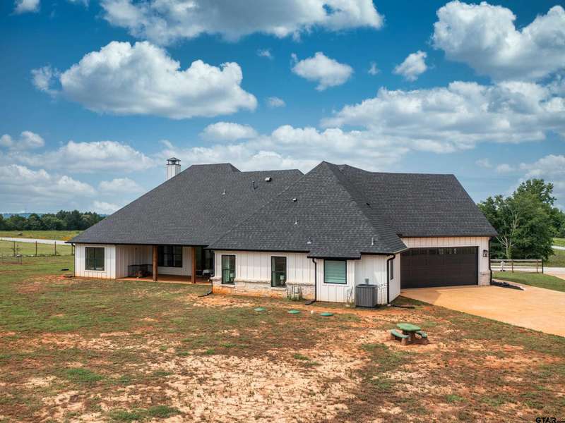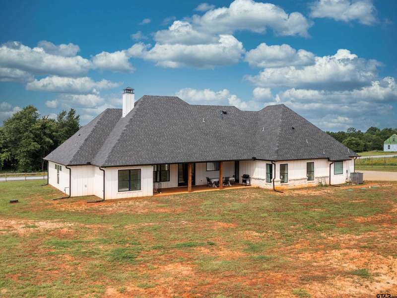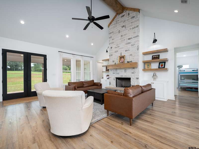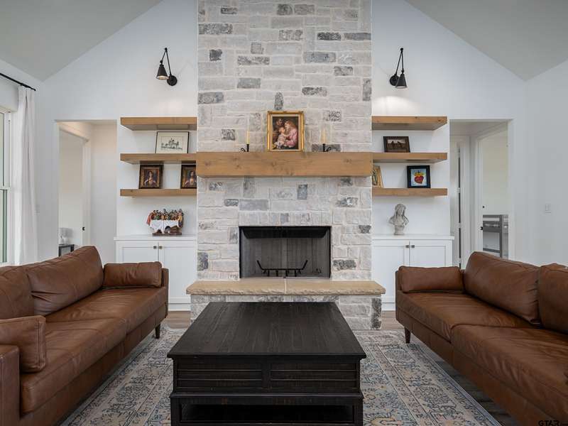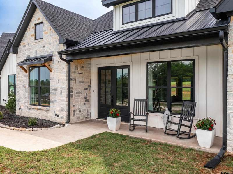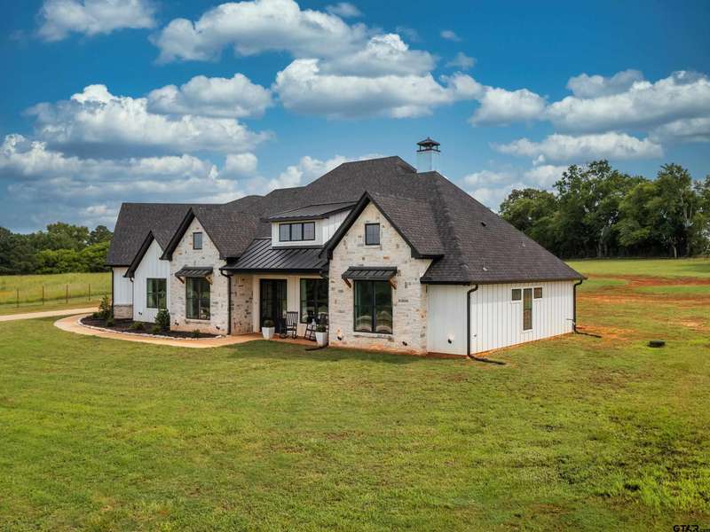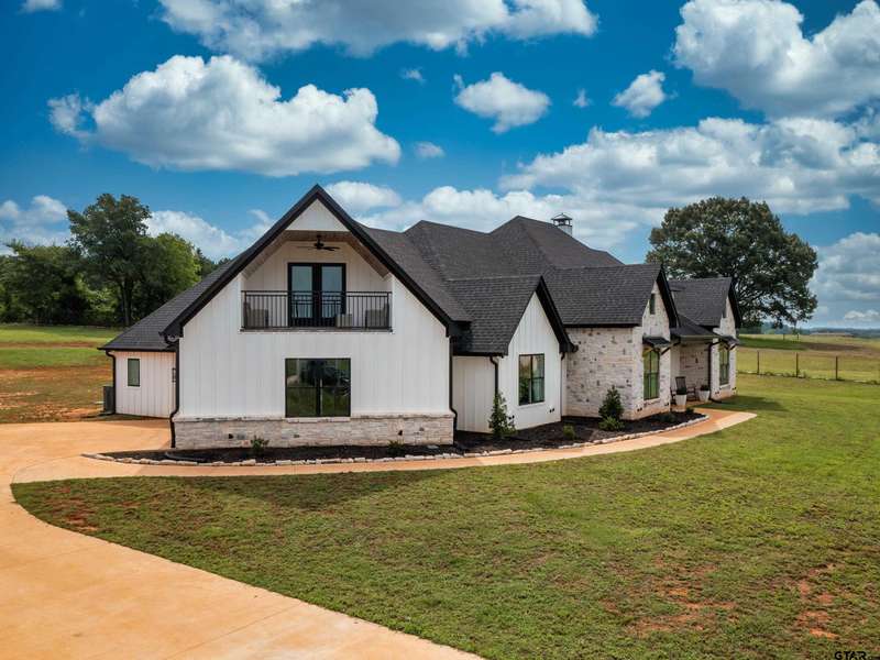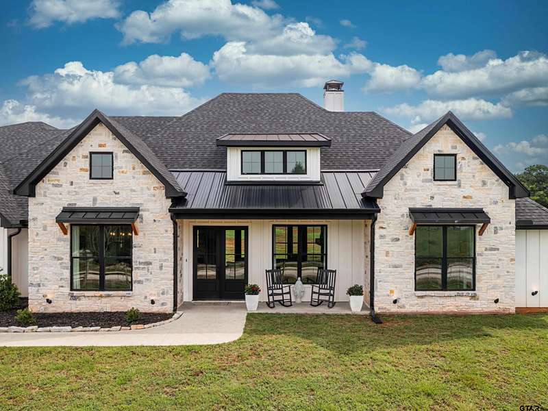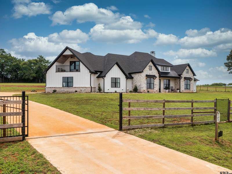 Nestled on 1.681 acres, this stunning Modern Farmhouse-style home offers the serenity of country living with all the perks of a vibrant neighborhood community. Light-filled & beautifully designed, this five bedroom, three-and-a-half-bath home features an open-concept layout that seamlessly blends living, dining & kitchen spaces with a thoughtful split-bedroom design. The spacious living room boasts a vaulted ceiling with a beam accent, a striking floor-to-ceiling stone fireplace with hearth & built-in storage with floating shelves. The chef's kitchen is a showstopper'equipped with a stainless commercial-grade six-burner cooktop with griddle & double ovens, a pot filler, custom range hood, quartz countertops, a farm sink & a large center island with bar seating. A generous walk-in pantry doubles as a functional butler's pantry with appliance-ready storage. The private main suite is a true retreat, featuring an en-suite bath with dual vanities, a freestanding soaking tub, a spacious walk-in shower & a primary closet with direct access to the utility room for added convenience. The utility room includes a sink, excellent storage & hanging space. Additional highlights include: a built-in mudroom with bench seating, drawers, & enclosed storage; two large guest bedrooms with walk-in closets & a shared Jack-and-Jill bath with double sinks; a 4th guest room with its own private en-suite bath; a versatile 5th bedroom that doubles perfectly as an office; & an upstairs bonus room/game room with a scenic sunset balcony. Step outside to enjoy the expansive yard'ideal for gardening, raising chickens, or simply relaxing under the large covered patio. Other upgrades include premium LVP flooring throughout (no carpet), a stylish powder bath, a fully fenced property, high-end finishes & an oversized 2 car garage. Close to UT Health North Campus & minutes from Tyler, this neighborhood offers a home school co-op that meets on-site and a community where nature & neighbors come together!